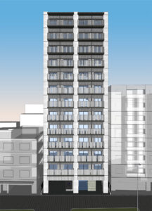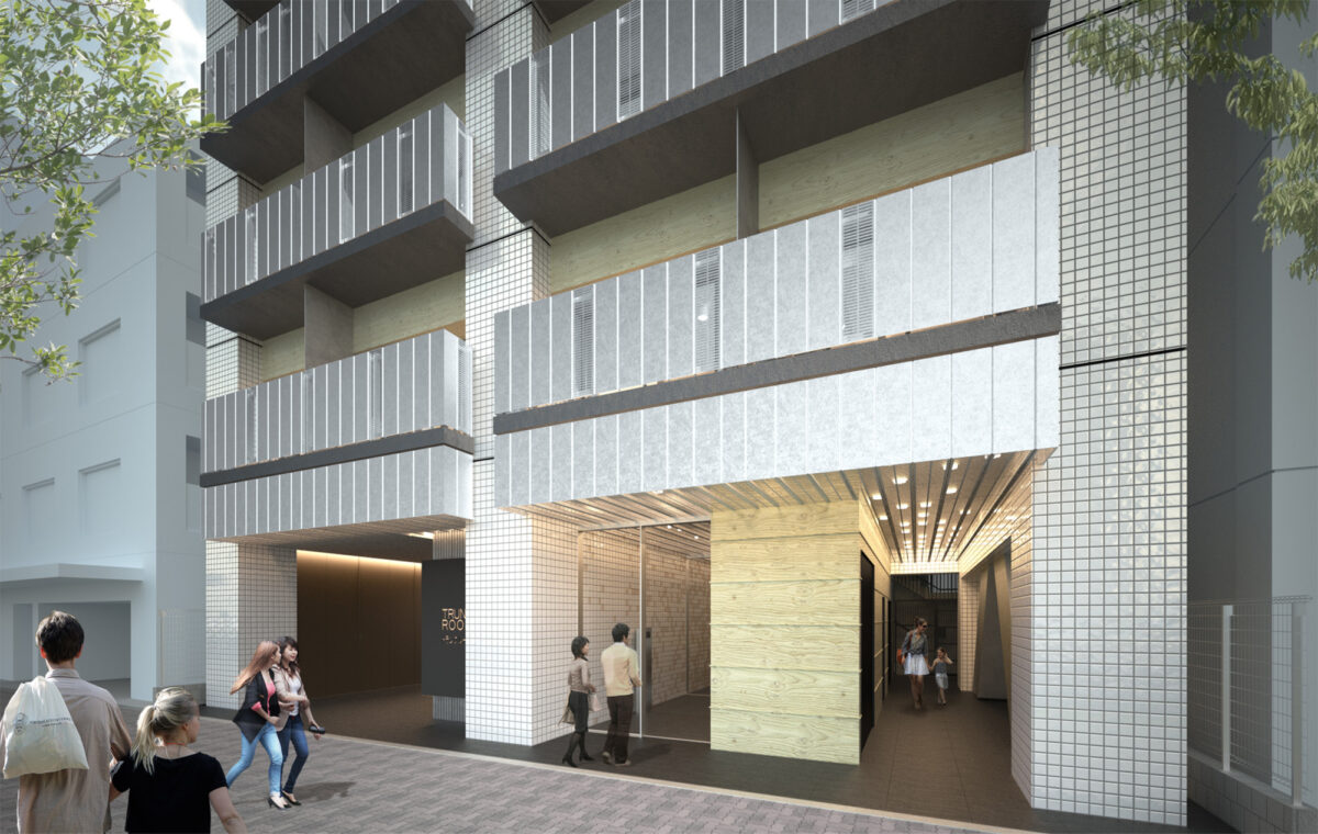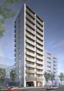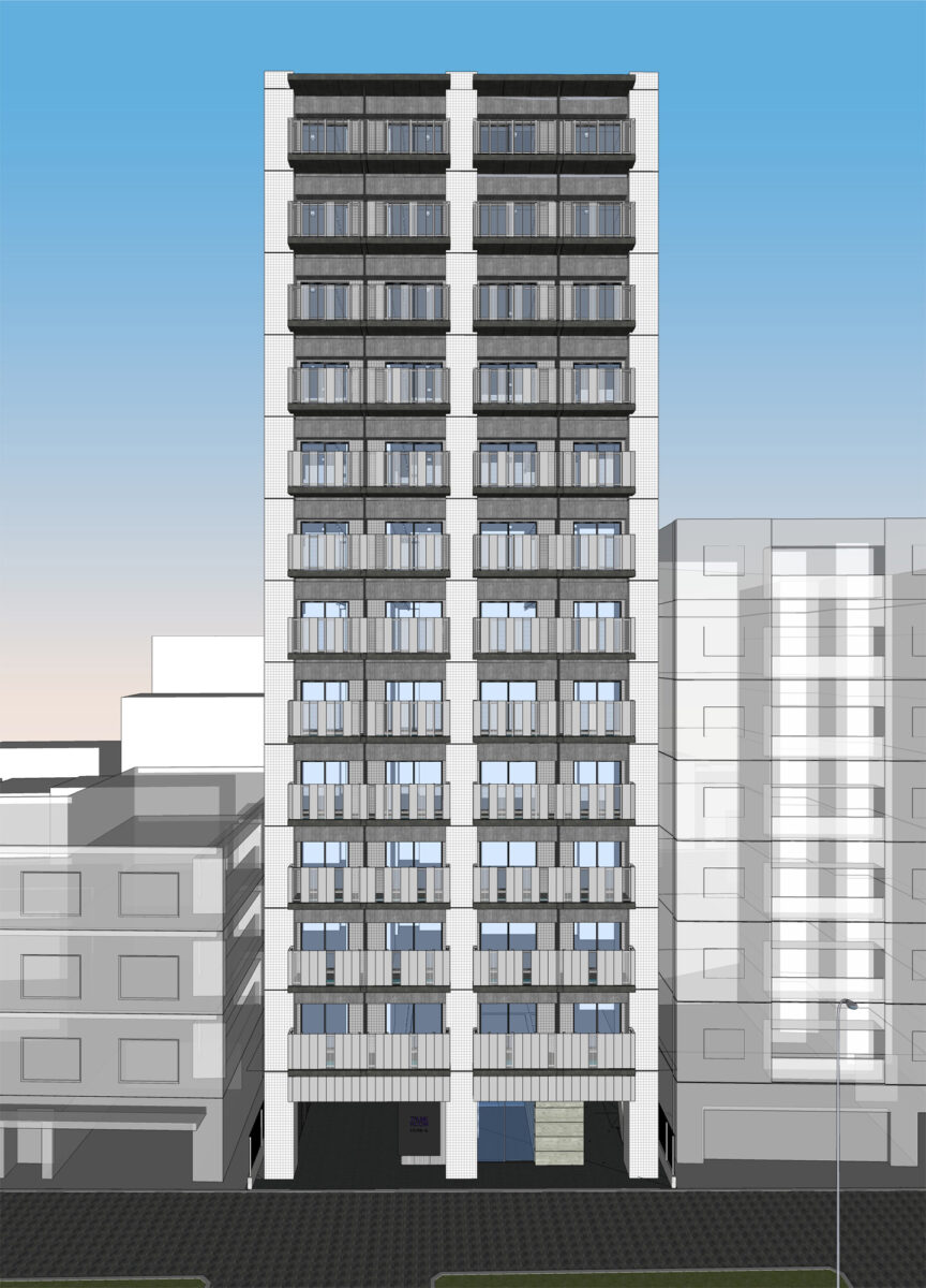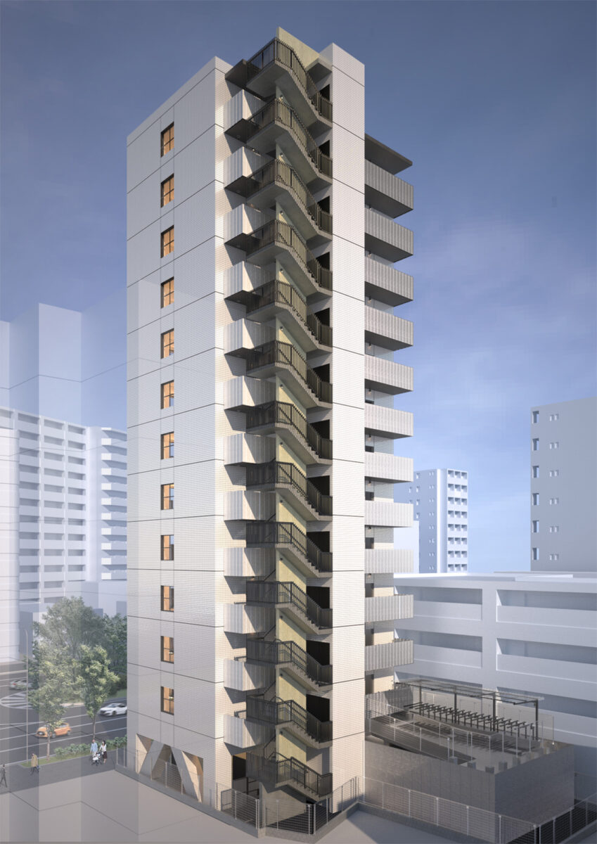 本計画は、国道沿いに建つ13階建て47戸の単身者向け賃貸住宅であり、地主の土地有効活用事業として企画立案から設計監理までトータルで手掛けたものである。事業の目的は第一に土地活用そのものであり、デザインはあくまでそのための手段と位置づけている。