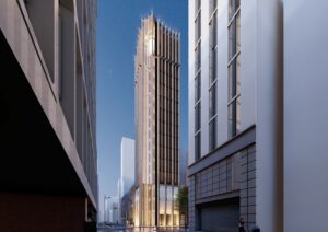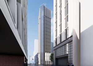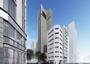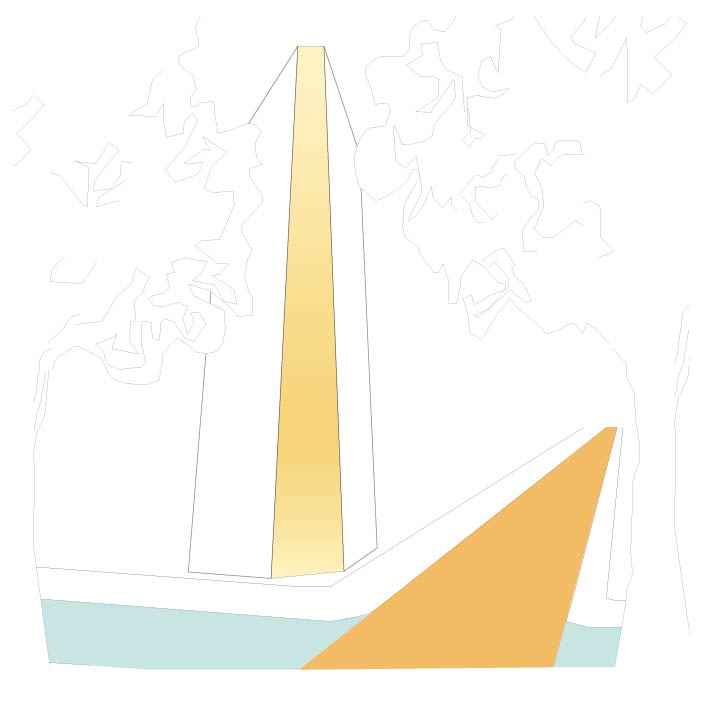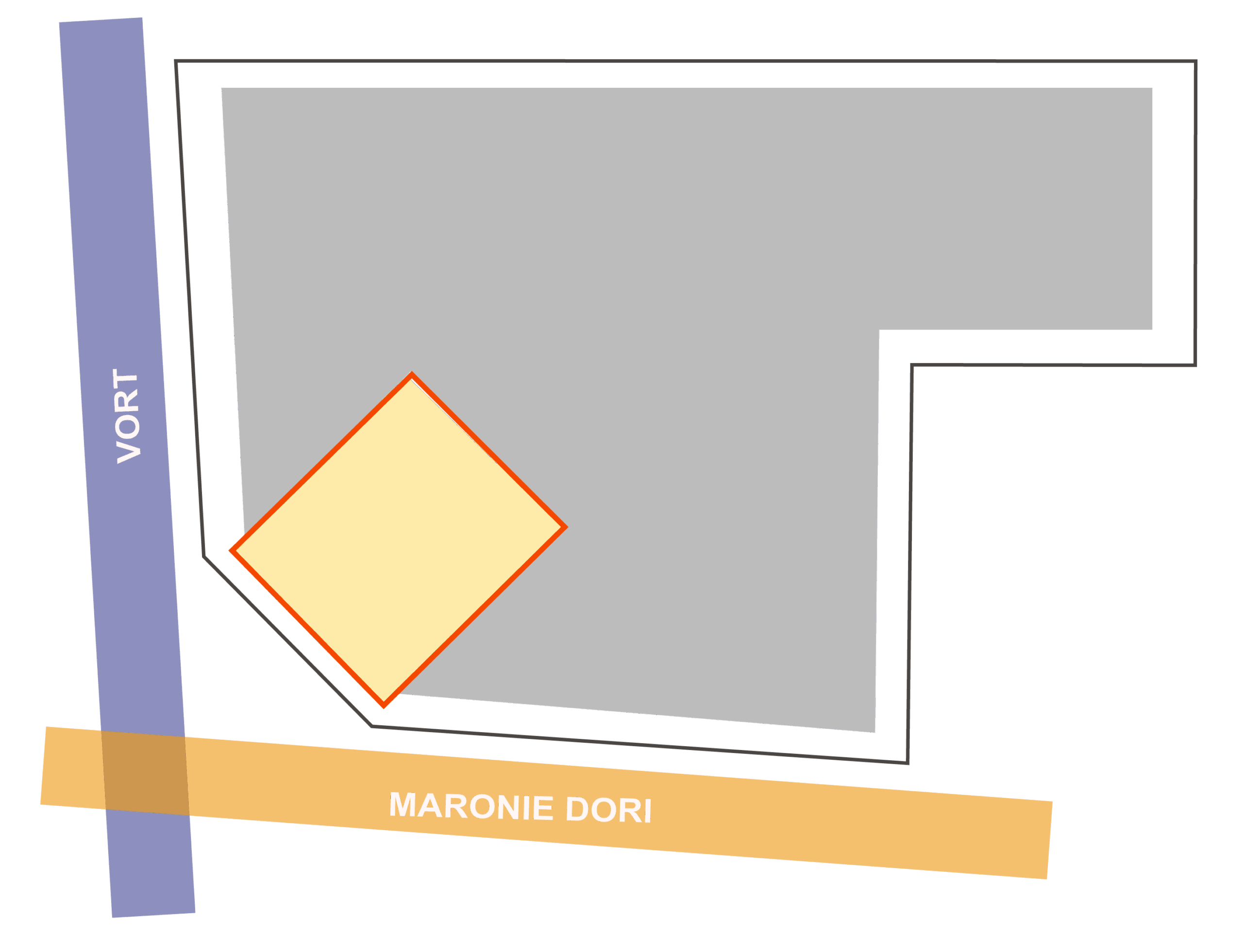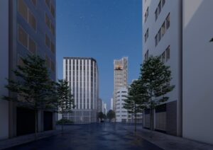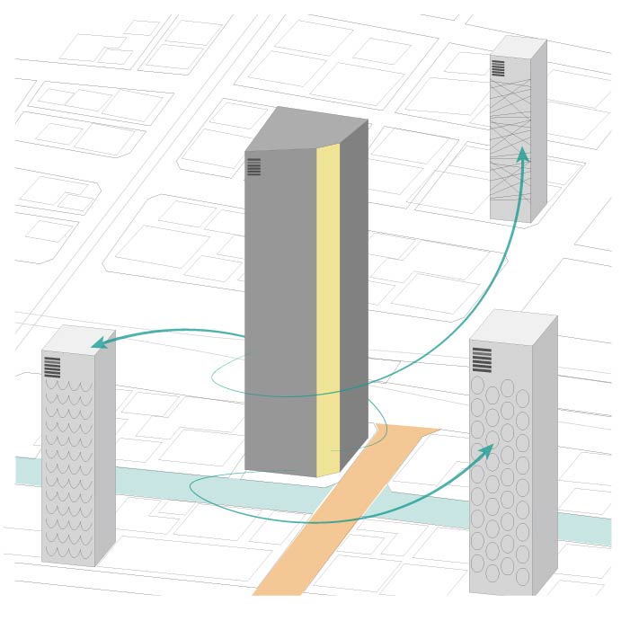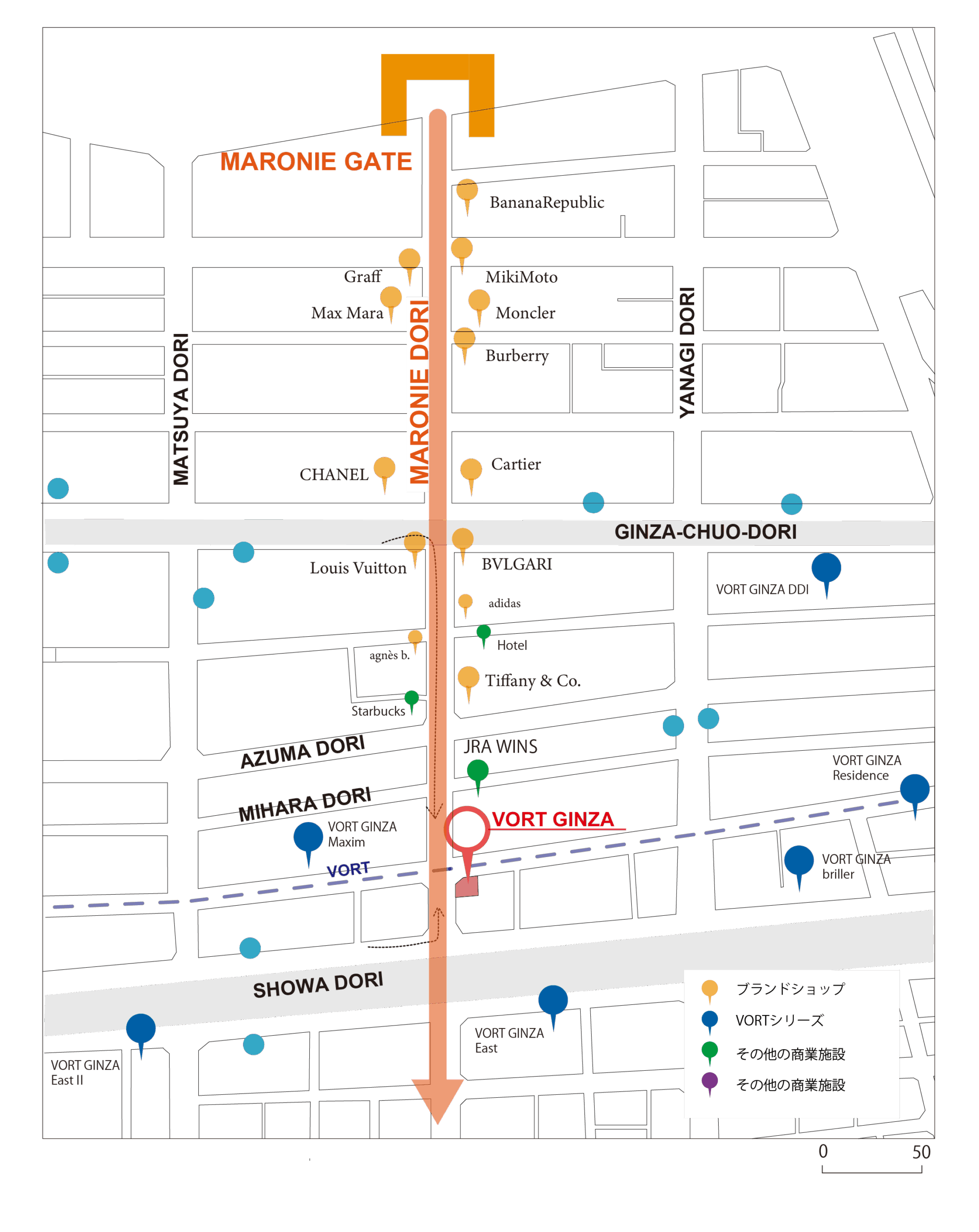 計画地を南北に横断するマロニエ通りはパリの代表する樹木であるマロニエの木を植えていることに由来して” マロニエ” 通りと名付けられた。そのため、パリをイメージさせる店舗や建物デザインが多く、銀座地域の中でも一流のブランド店が多いエリアとなっている。入口には商業施設の” マロニエゲートがあり、それらの賑いをマロニエ通りの対角に位置する計画地まで延伸させることが重要となる。また、周辺には多くのVORT シリーズが点在しており、VORT シリーズの中心となる建築を目指すことがポイントになると。マロニエ通りとVORTシリーズが並ぶ通りが交差する隅切り部分に頂部まで伸びる形状のエレベーターを計画し、銀座のランドマークを目指す。