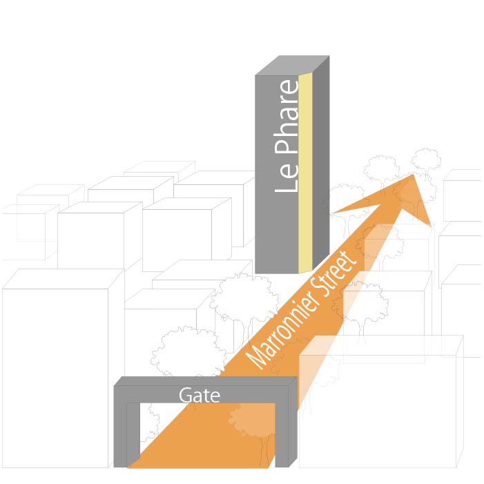 名称案として示されている「Le Phare」「Beacon」「Torch」などは灯りや導きを象徴し、光を放ち街の先導役となる建築像を示唆している。