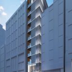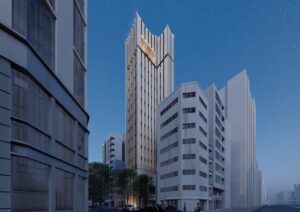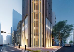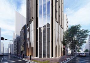 銀座2丁目は、マロニエ通りが持つパリの風景を想起させる華やかなブランド街区の文脈に呼応し、このエリアに多数点在するVORTシリーズの中でも「中心」として際立つ存在を目指す商業建築である。敷地は交差点角に位置し、隅切り部分から伸びるエレベーターシャフトが頂部まで達する垂直的な構成は遠景でも視認され、都市のランドマークとなるポテンシャルを持つ。