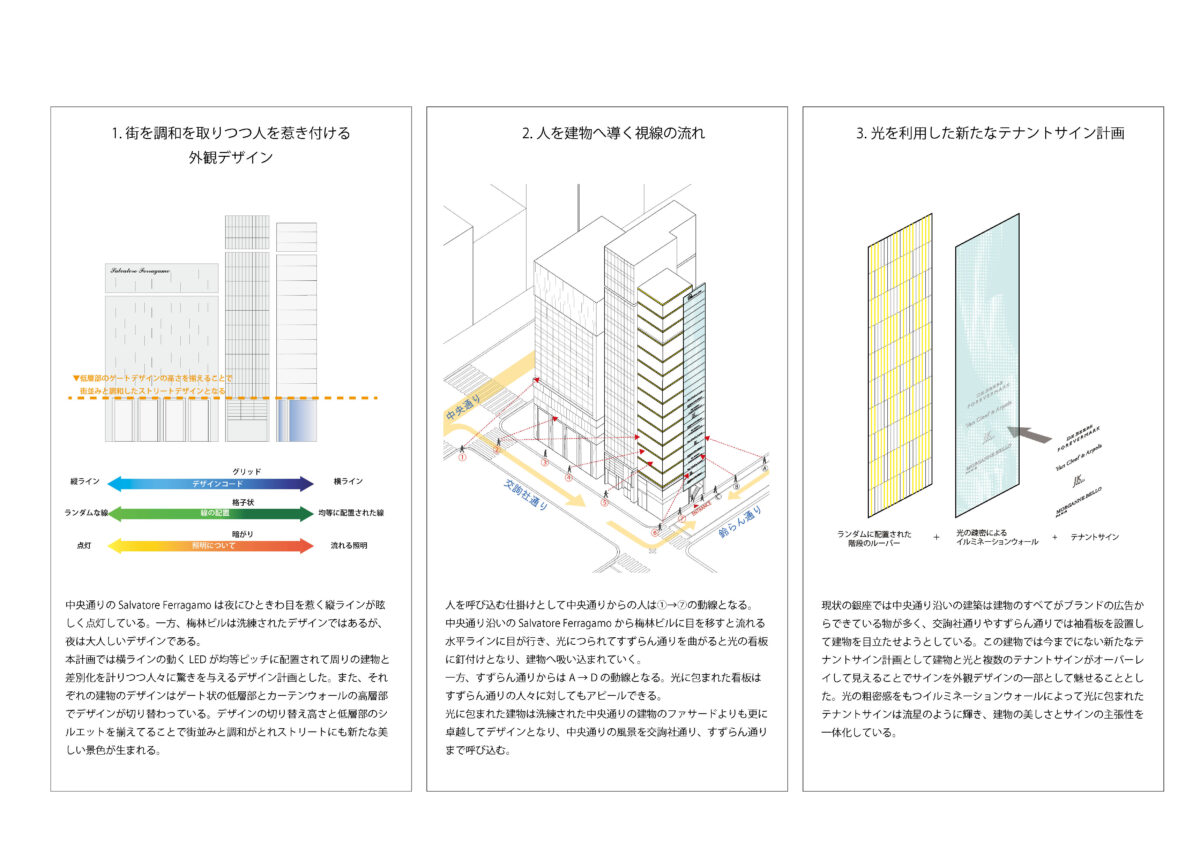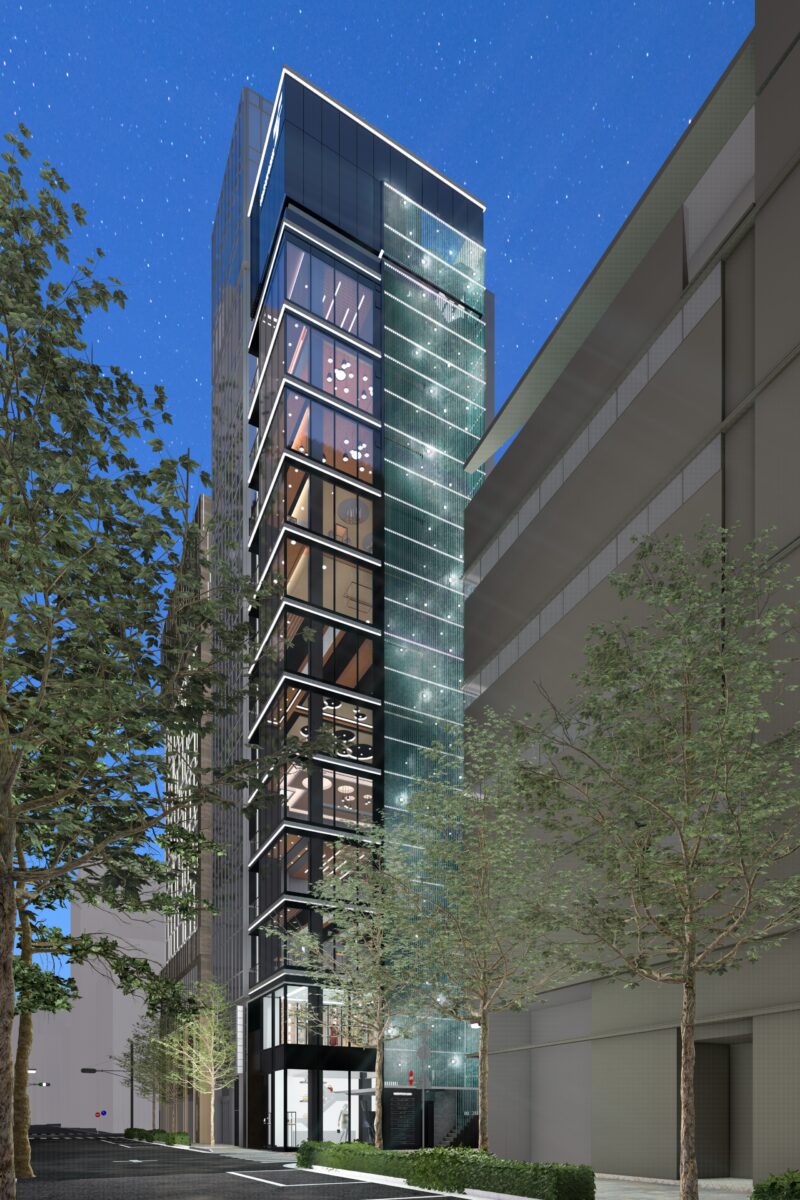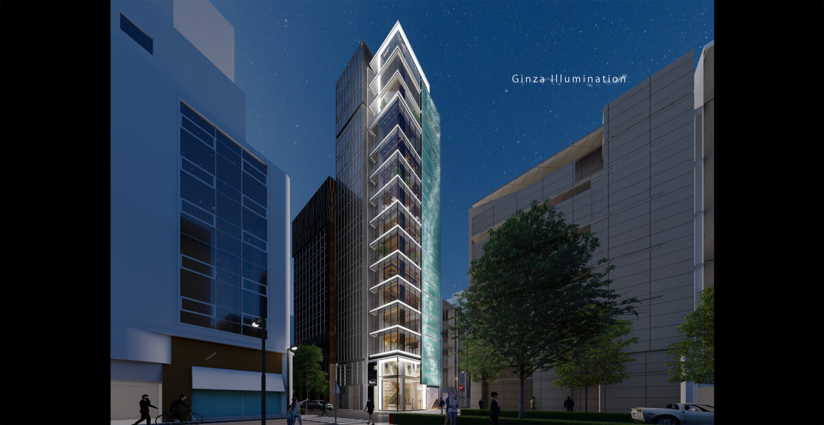 銀座は通りごとに異なる表情と歴史を持つ街であり、本計画ではその多層的な都市性を尊重しながら、表通りと裏通りの双方に対して異なる建築的応答を与えることで、敷地の価値を最大化することを目指した。限られた敷地条件のもとで、複雑な建築構造、設備計画、照明デザインを高い次元で統合するため、BIMを活用した精緻な三次元検討を行い、意匠・構造・設備の整合性と施工性を同時に担保している。