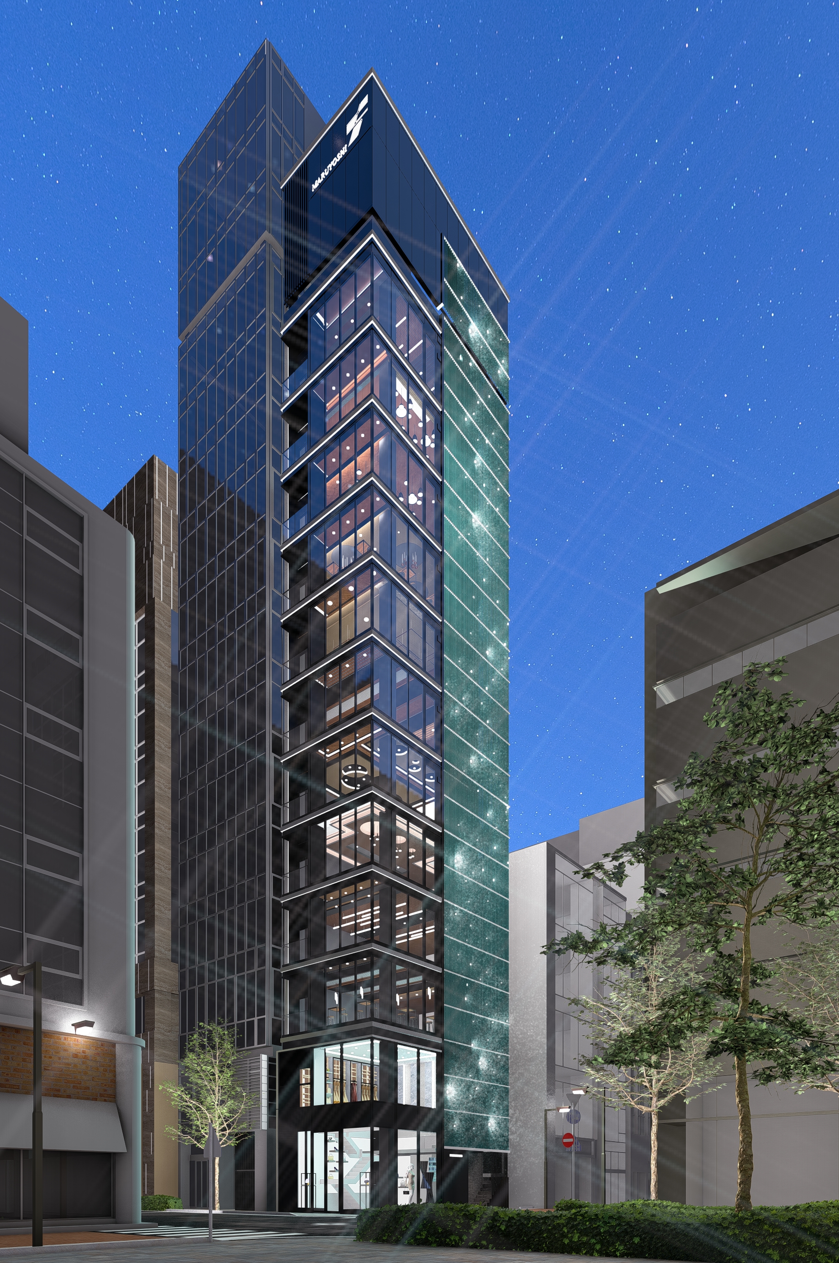ガラススクリーンの奥に光るスラブを上下から挟み込む発光ゲートは、昼夜を問わず強いアイキャッチとなり、通行者を街から建築へと誘導する。また、細い裏通り側には天の川をモチーフとした繊細な光のイルミネーションを配置し、銀座の路地が持つ親密さと奥行きを光によって可視化している。