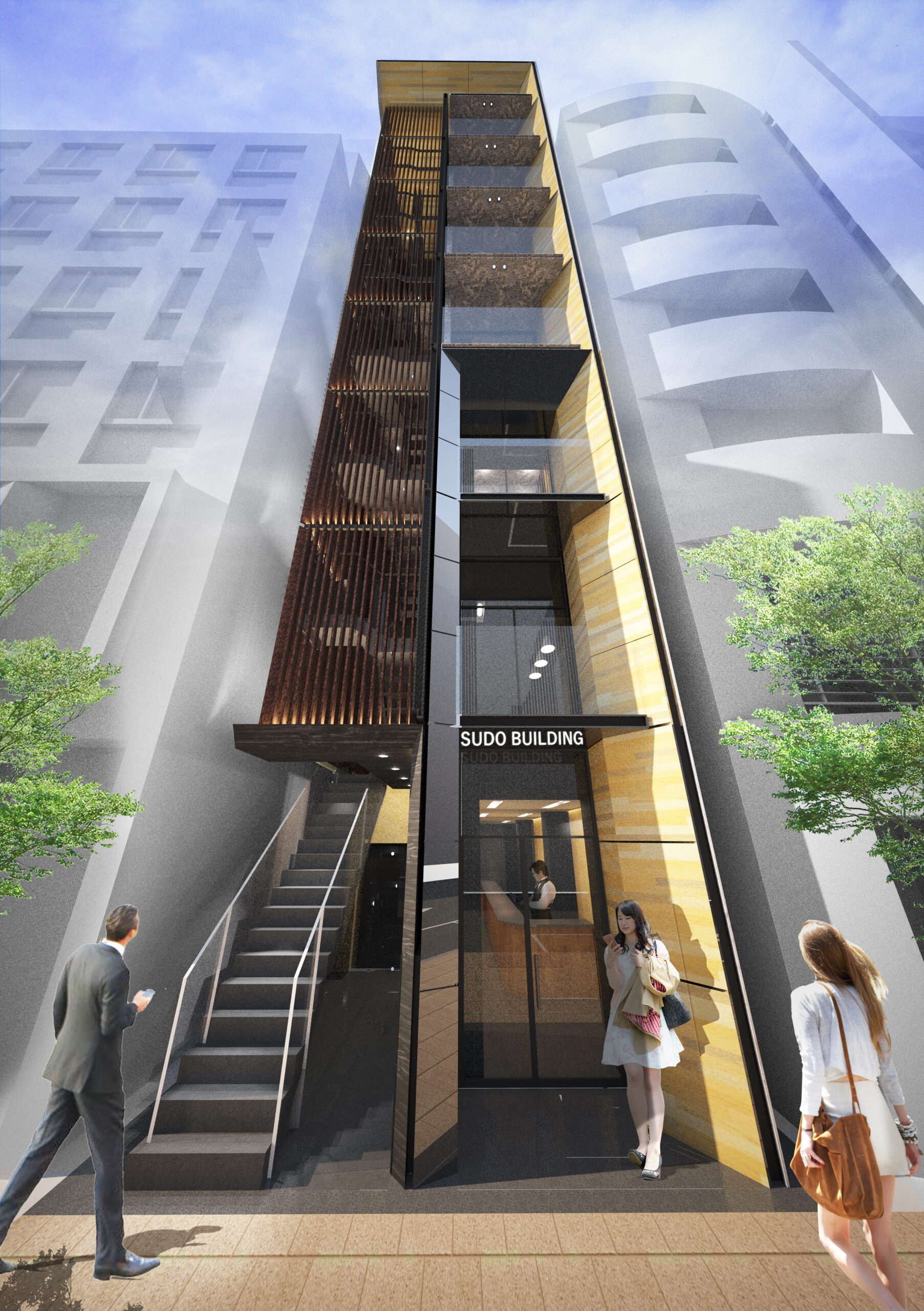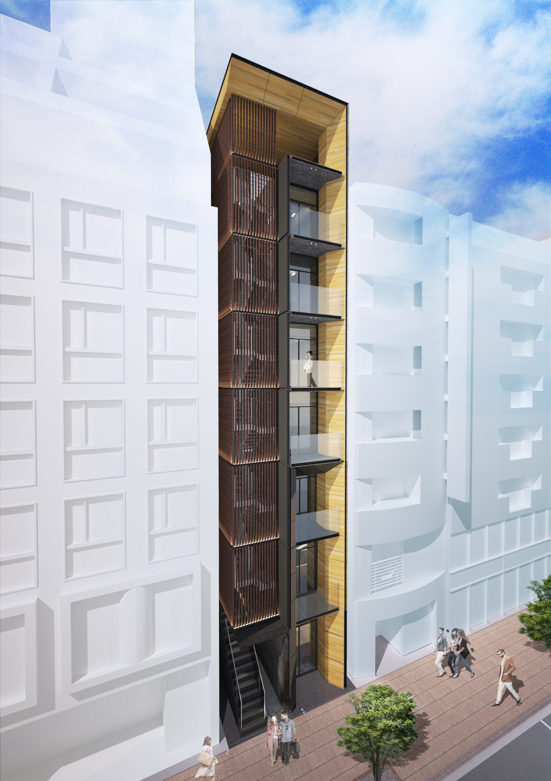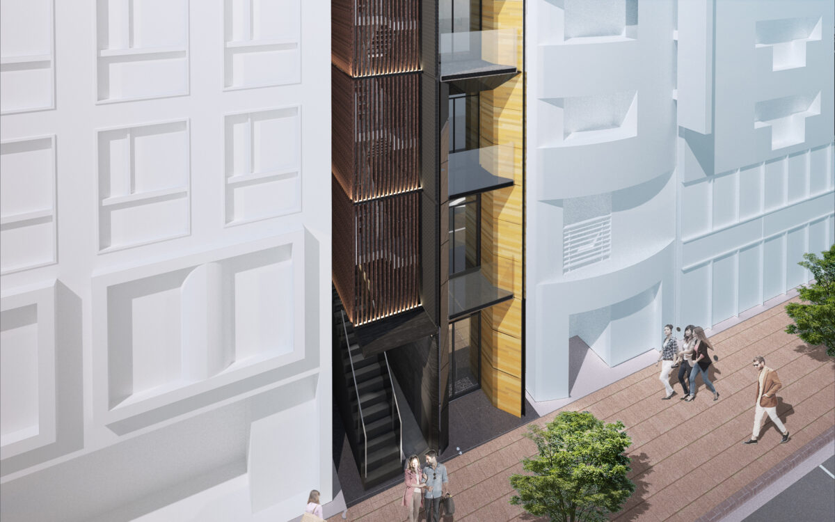 銀座のペンシルビル建替計画において、低層部には長年愛されてきた老舗バーが入居し、そのオーナーが大切に守ってきた空間には、現在では入手困難な古材が多く使用されていた。これらの貴重な古材を一部再利用することで、歴史の継承と建物全体の刷新を同時に実現している。新しい計画では、既存の木を基調とした落ち着いた雰囲気を踏襲しつつ、古材を丁寧に組み合わせることで、内部空間に深みと温かみを持たせ、場所の記憶が息づく豊かな建築空間として再生している。