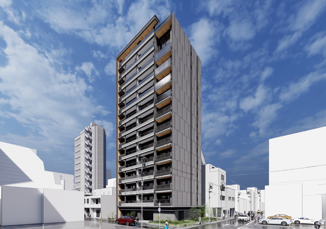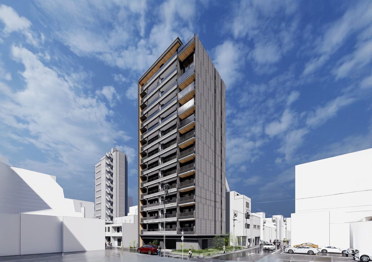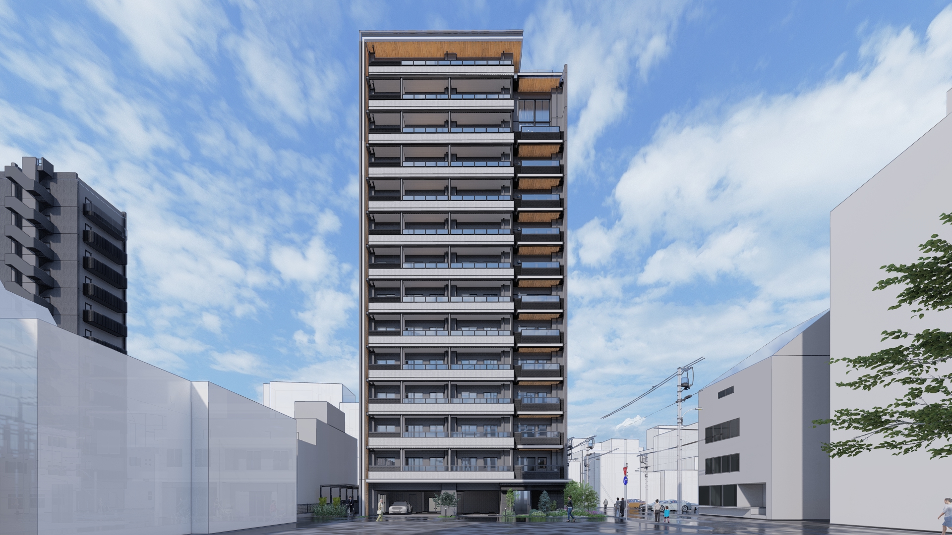 本計画では、街並みとの調和と居住性の両立をテーマとした。外観は西洋美術館の造形的特徴を参照した彫刻的なRC打放し仕上げとし、RCの質感と量塊感により、上野という文化的文脈に呼応しながら都市スケールの中で確かな存在感をもたせている。一方で、東上野の低層住宅地に隣接する14階建てという条件から、下町的な街並みとの隔たりを生まないような配慮が求められた。そこで、バルコニーを街区スケールに合わせて細やかに分節し、グレーのマリオン材で垂直方向のリズムを与えつつ、木目調塗装により木造家屋の多い周辺環境と素材感で調和を図っている。道路側には引きを取り緑化された空地を設けることで、周囲への圧迫感も軽減した。