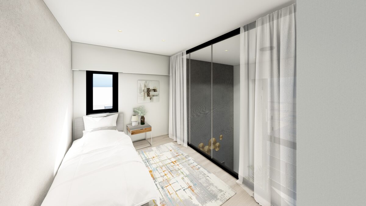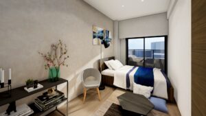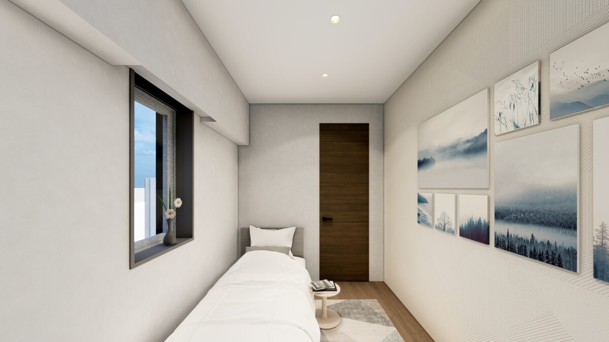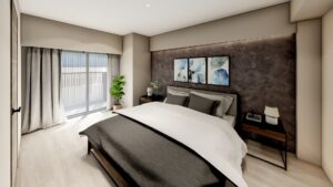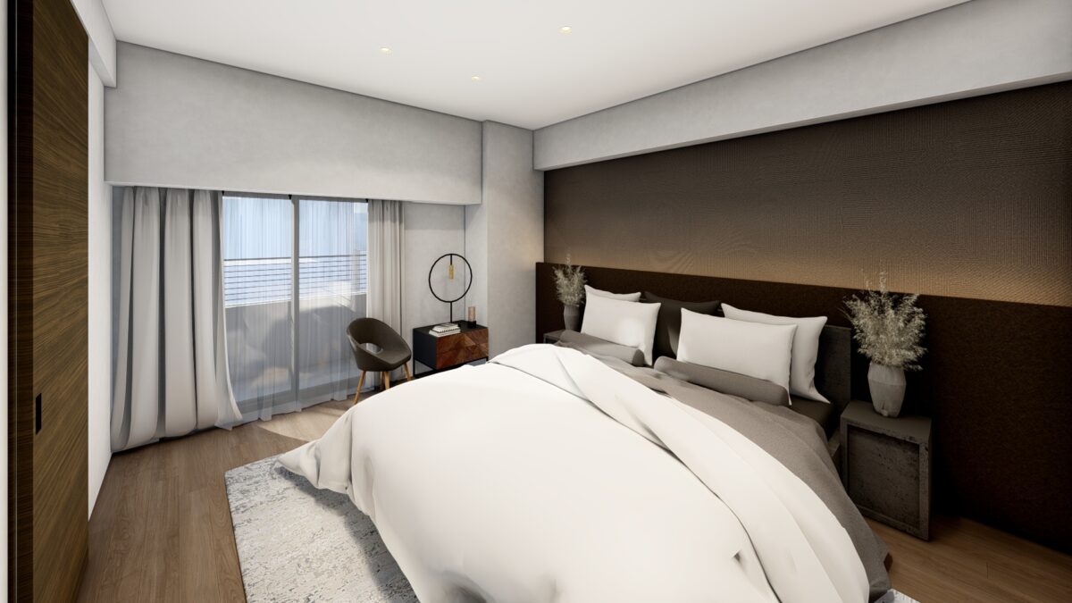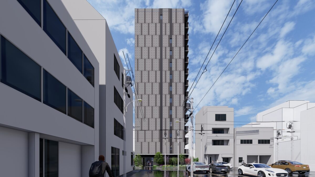 本計画では、街並みとの調和と居住性の両立をテーマとした。外観は西洋美術館の造形的特徴を参照した彫刻的なRC打放し仕上げとし、RCの質感と量塊感により、上野という文化的文脈に呼応しながら都市スケールの中で確かな存在感をもたせている。一方で、東上野の低層住宅地に隣接する14階建てという条件から、下町的な街並みとの隔たりを生まないような配慮が求められた。そこで、バルコニーを街区スケールに合わせて細やかに分節し、グレーのマリオン材で垂直方向のリズムを与えつつ、木目調塗装により木造家屋の多い周辺環境と素材感で調和を図っている。道路側には引きを取り緑化された空地を設けることで、周囲への圧迫感も軽減した。