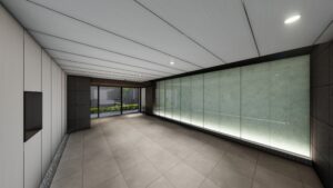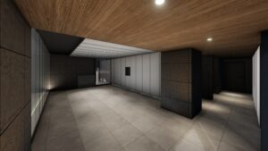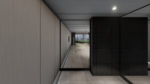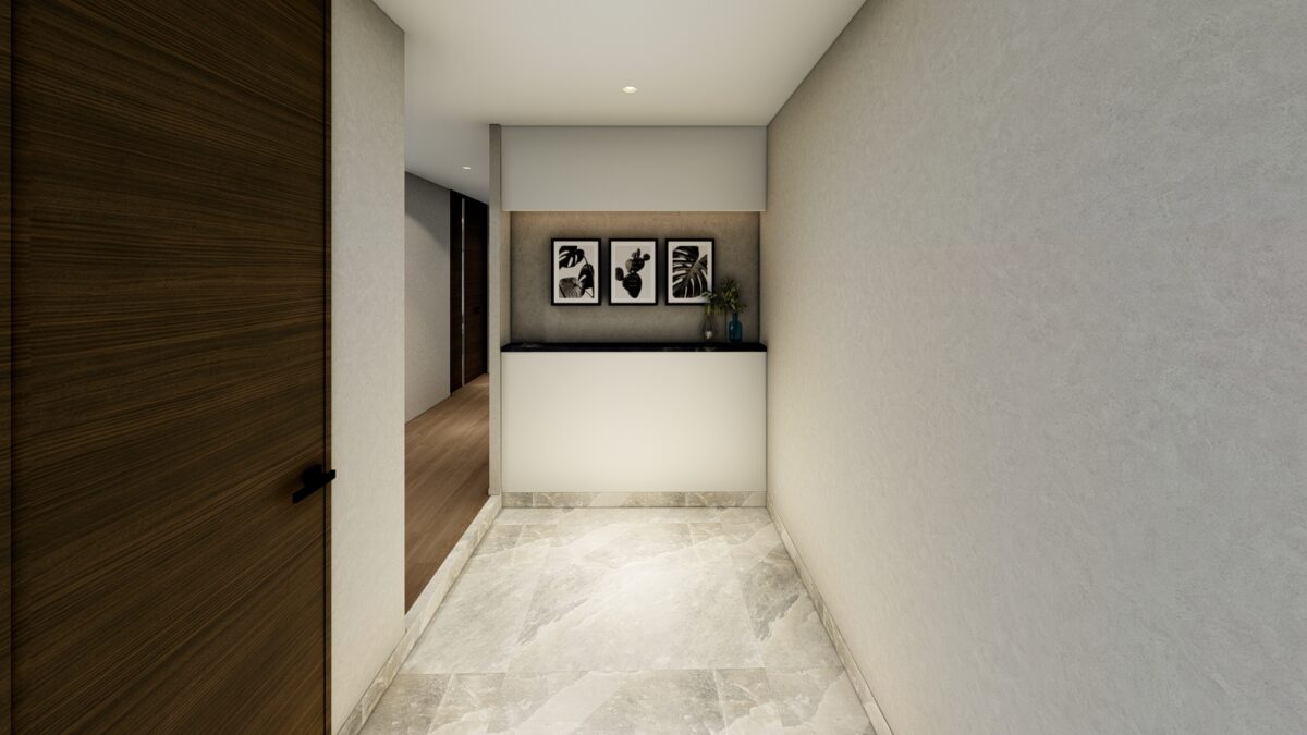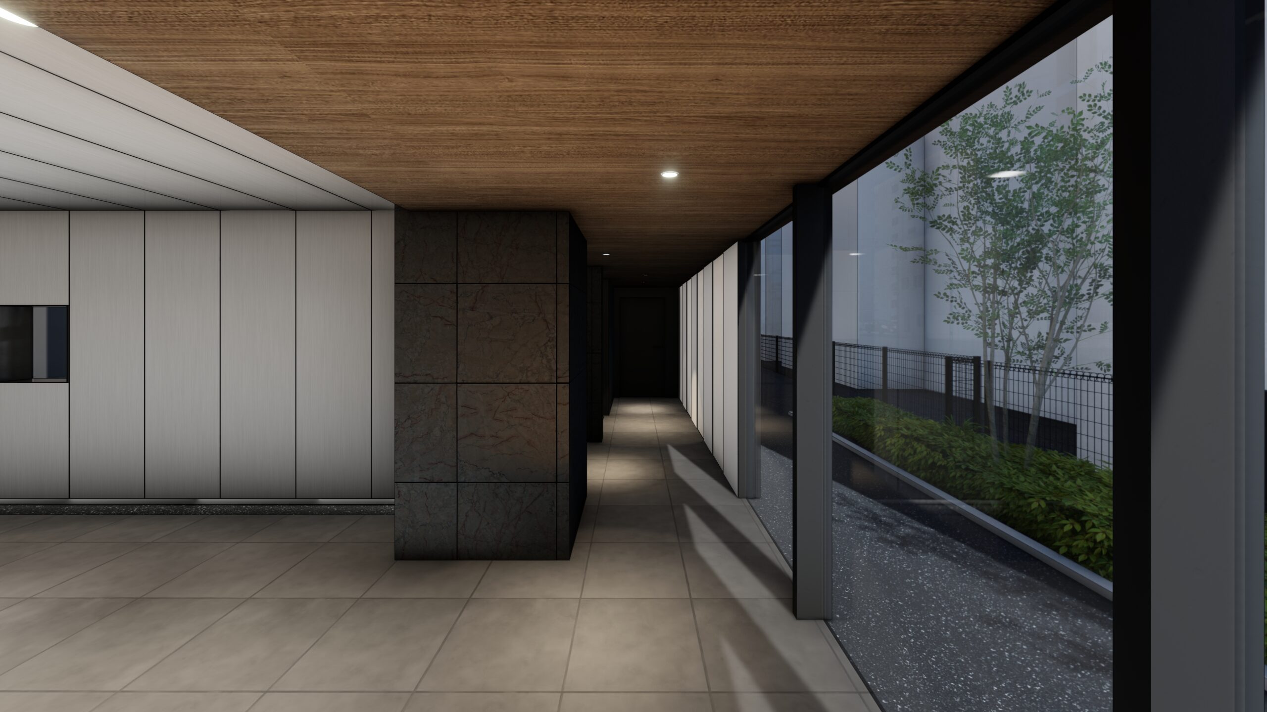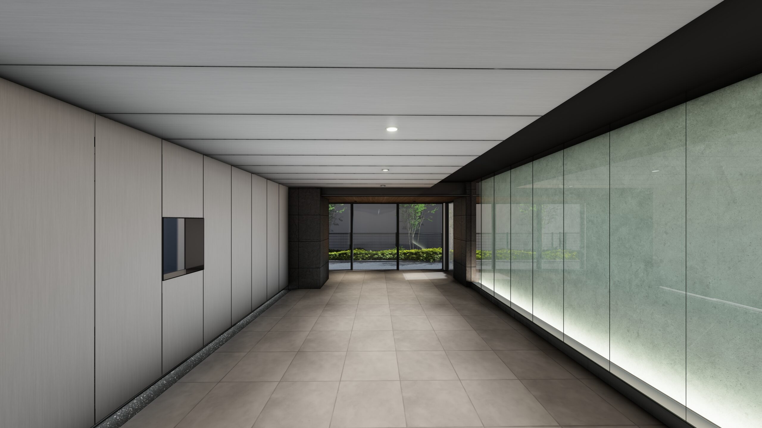 素材の重なりと水平ラインが、私領域へと視線を誘う導入空間。