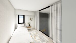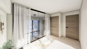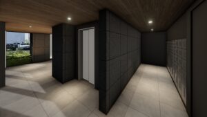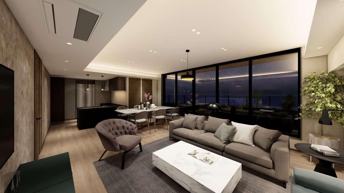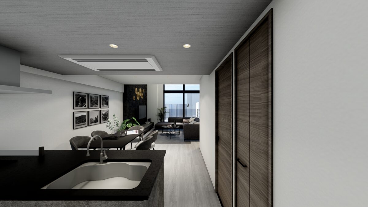 居住性の面では、前面道路による厳しい道路斜線制限で天空率により削られた上部を最上階住戸のルーフバルコニーとして積極的に活用し、その開放的な外部空間に面して大開口のLDKを配置することで、明るく伸びやかな住空間を実現している。さらにメゾネット住戸には約5mの吹抜けを設け、2層分にわたる大開口によって垂直方向の開放感と光の広がりを感じられる、開放的な居住体験を創出している。
