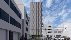 総戸数48戸の賃貸向け共同住宅である。30~50㎡程の一般的な1LDK~2LDKを中心に構成しつつ、130㎡の最上階ワンフロア住戸と、100㎡の吹抜メゾネット住戸の2戸をプレミアム住戸として計画している。