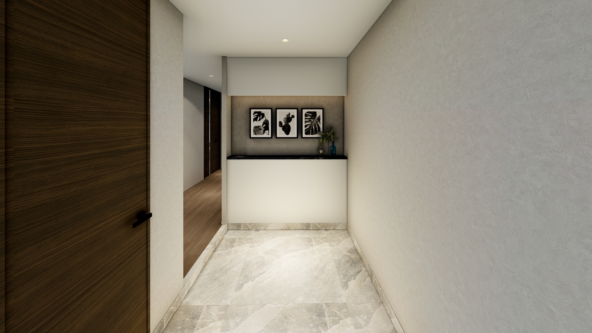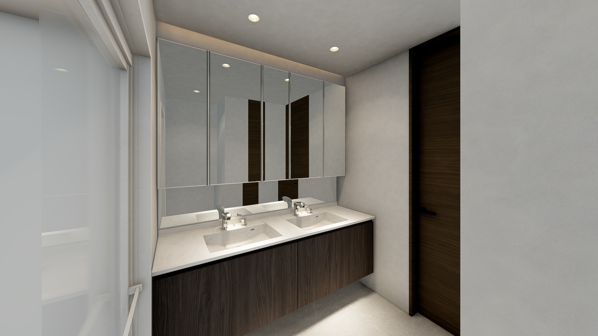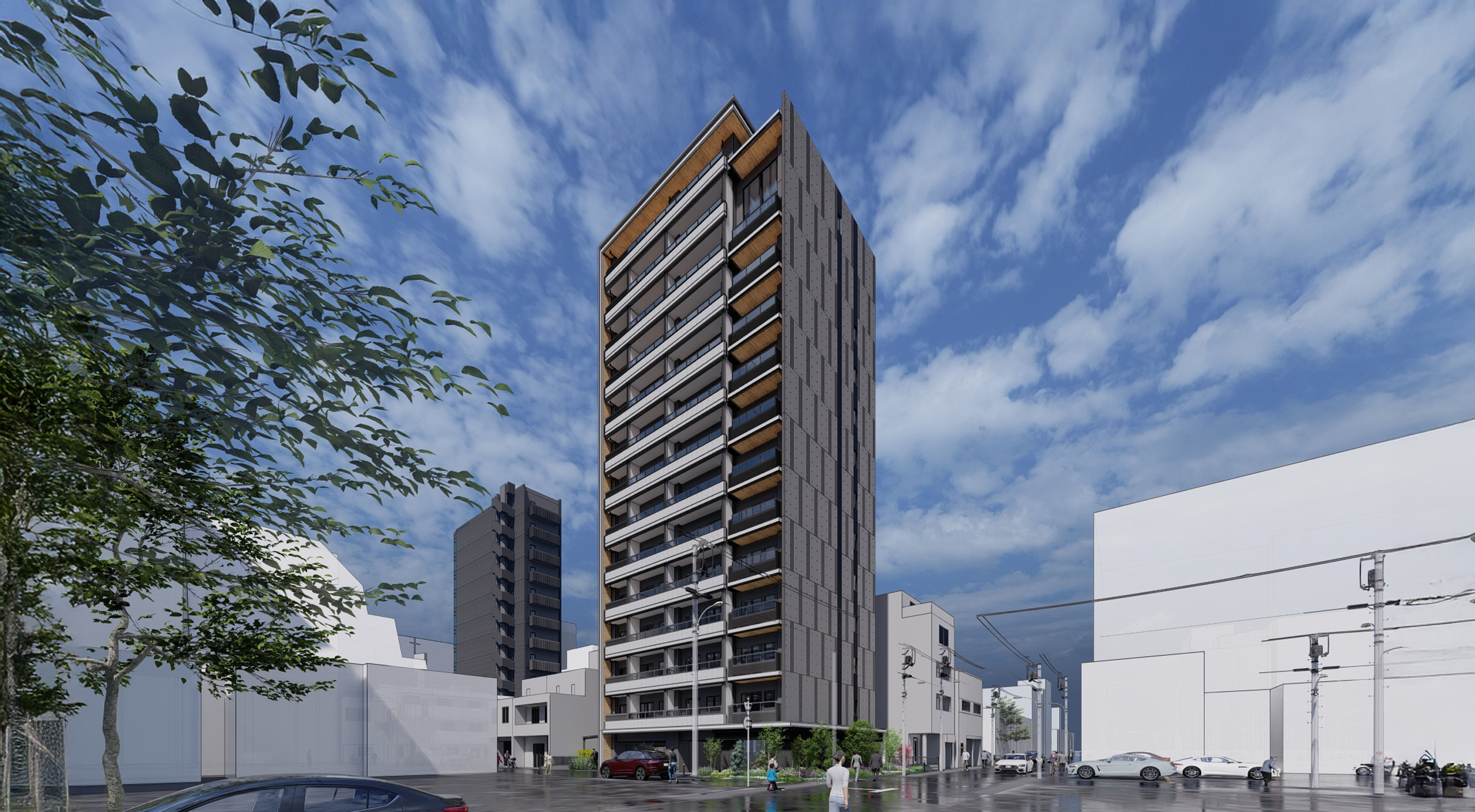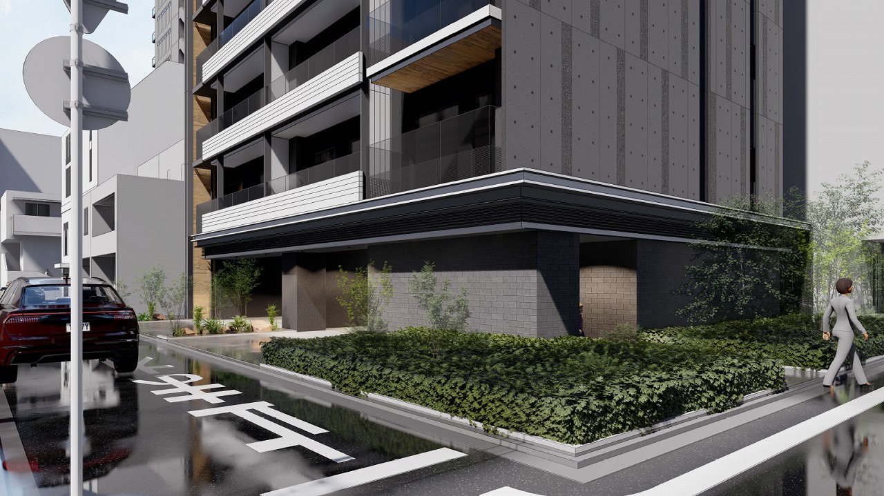 本計画では、街並みとの調和と居住性の両立をテーマとした。外観は西洋美術館の造形的特徴を参照した彫刻的なRC打放し仕上げとし、RCの質感と量塊感により、上野という文化的文脈に呼応しながら都市スケールの中で確かな存在感をもたせている。一方で、東上野の低層住宅地に隣接する14階建てという条件から、下町的な街並みとの隔たりを生まないような配慮が求められた。そこで、バルコニーを街区スケールに合わせて細やかに分節し、グレーのマリオン材で垂直方向のリズムを与えつつ、木目調塗装により木造家屋の多い周辺環境と素材感で調和を図っている。道路側には引きを取り緑化された空地を設けることで、周囲への圧迫感も軽減した。
