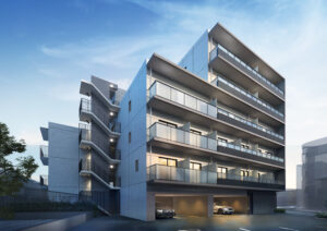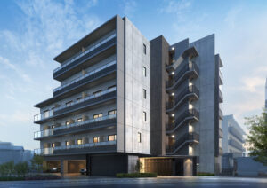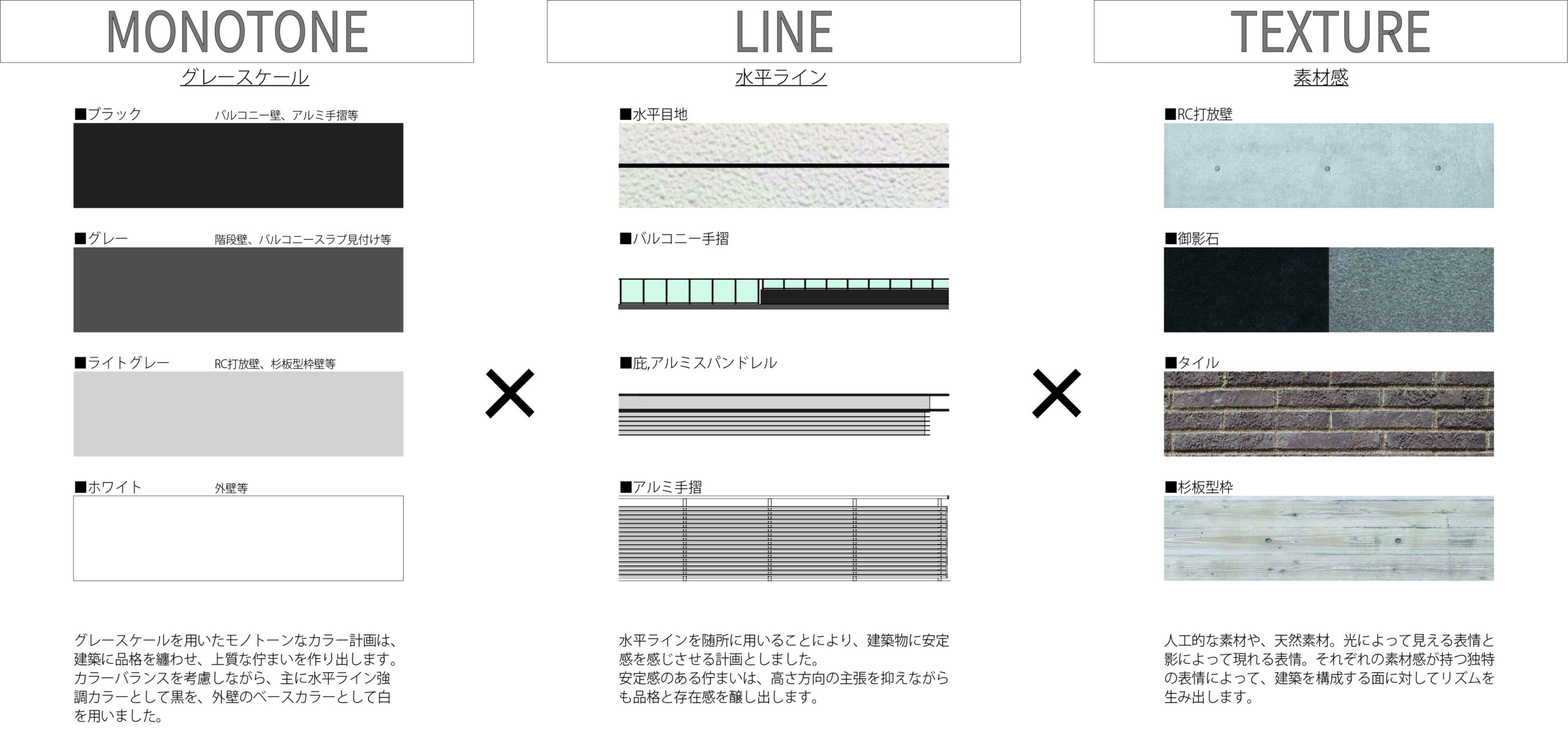 寝室とリビングをゆるやかに分節することで、ワークとリラックスの切り替えがしやすい構成とした。外観は、想定する入居者層のライフスタイルや嗜好を分析し、白・グレー・黒を基調としたモノトーンの素材をアッセンブル。過度な装飾を排し、陰影とラインの強弱で表情をつくることで、都心で働く若い世代の感性に響く、シャープでありながら温度感のあるデザインを目指している。