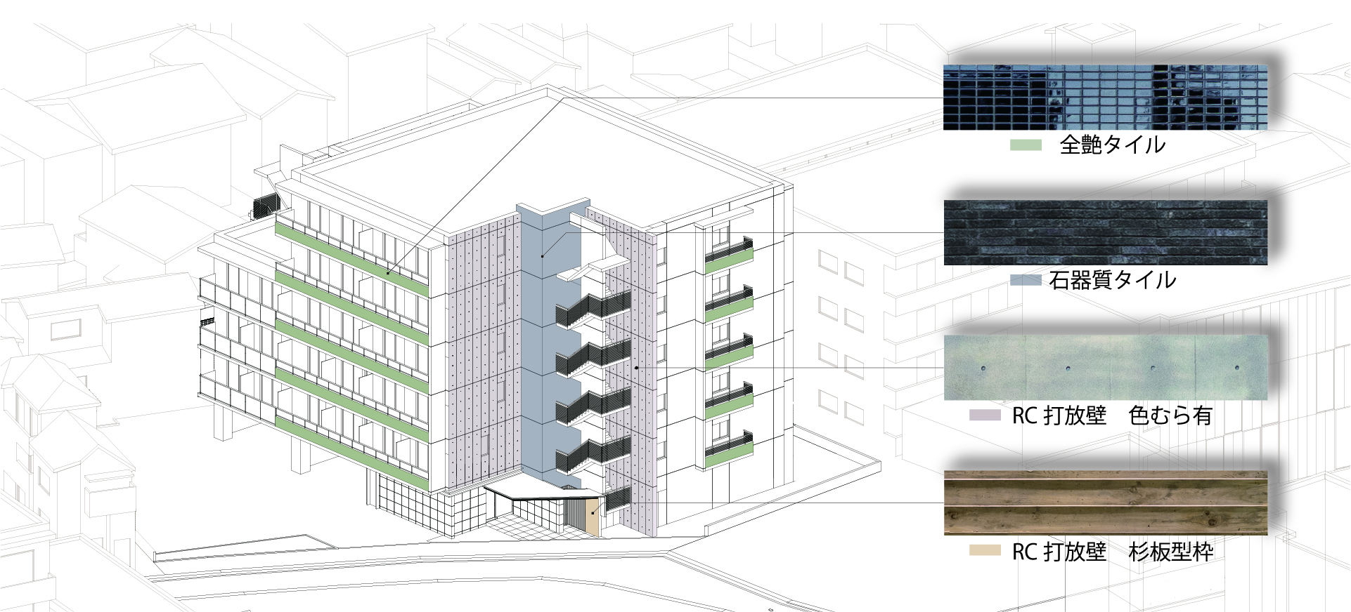 エントランス空間は、光壁、打放しコンクリート、大判タイル、そして木調のテクスチャという、性質の異なる四種の素材が直接的に交錯する構成を主眼としている。