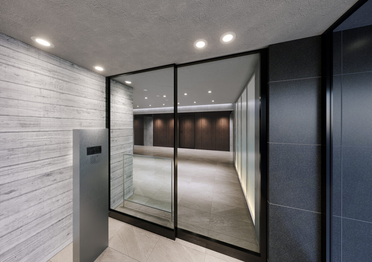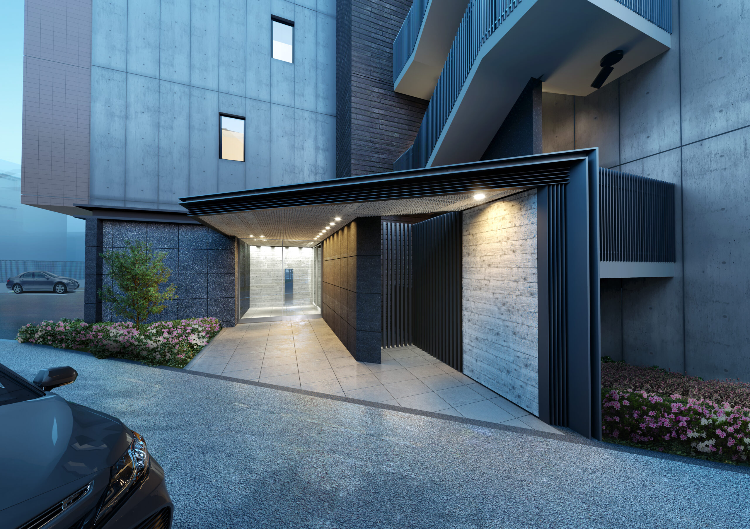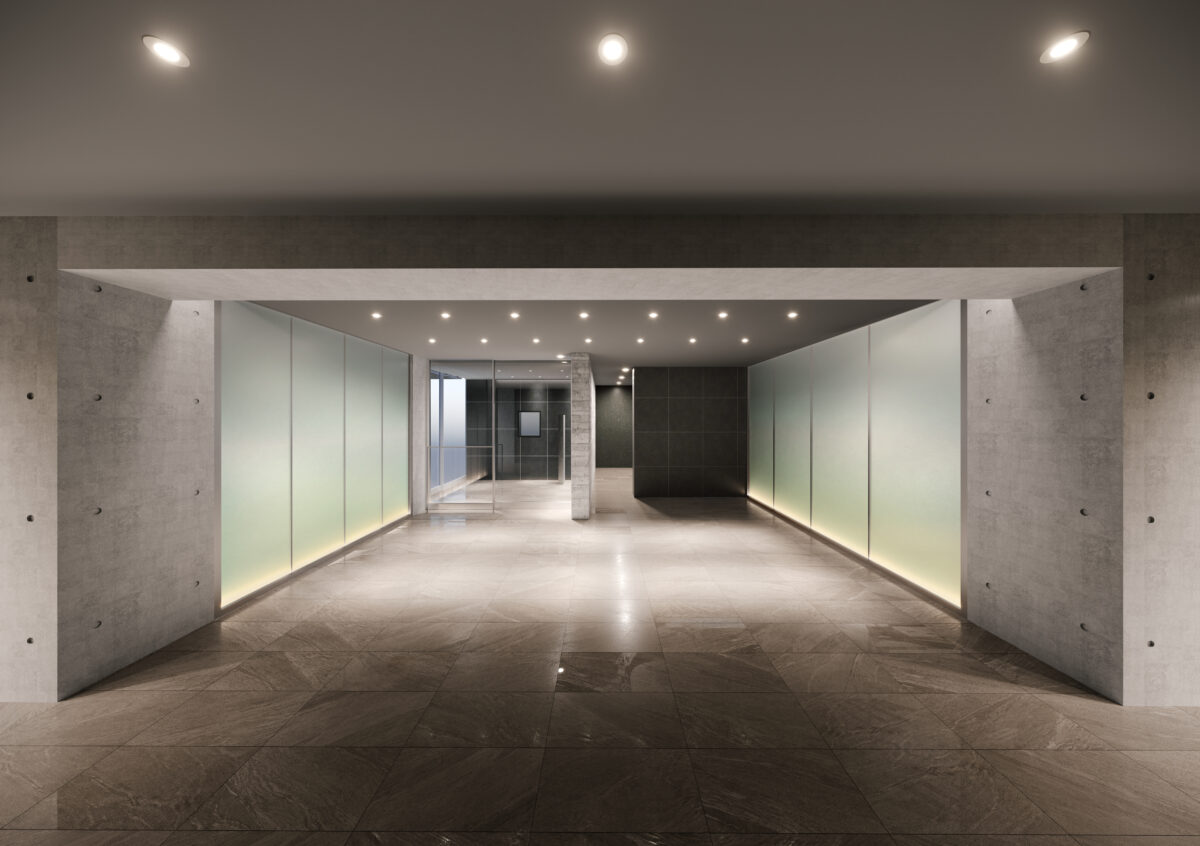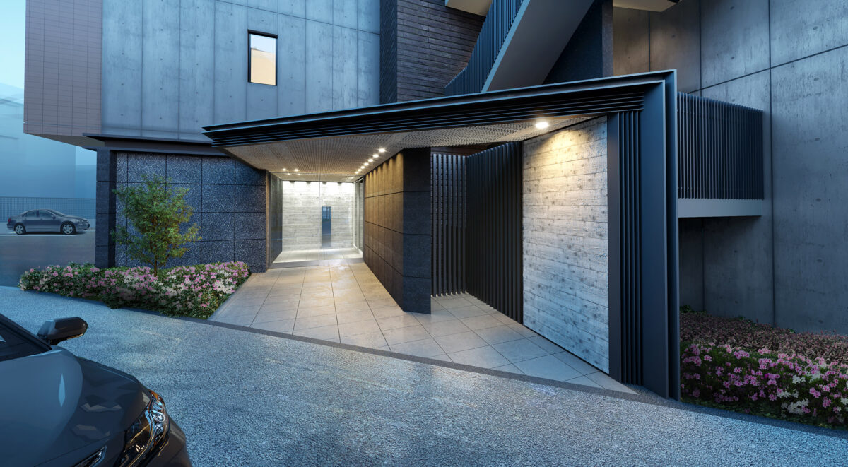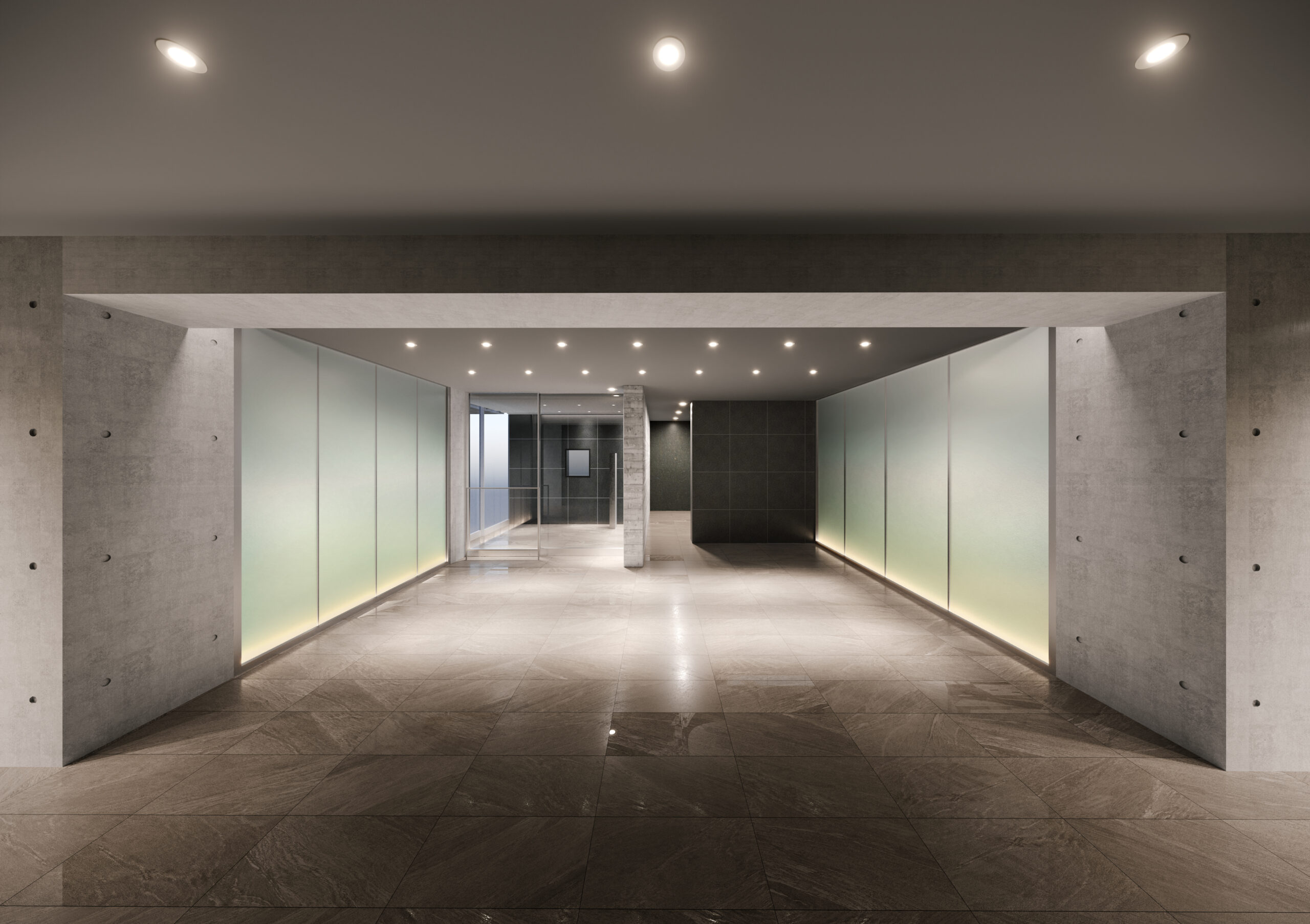 各素材が持つ固有のテクスチャは、ダウンライトによる陰影の中でその「ぶつかり合い」をより鮮明にし、エントランスへと向かう動線に緊張感と気品を付与する。