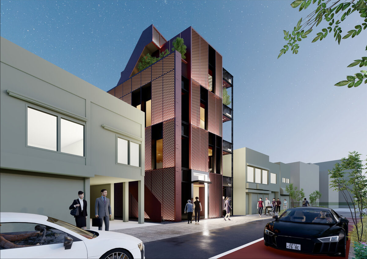 本計画は、池尻大橋駅からほど近い近隣商業地域に位置するテナントビルであり、周囲に連なる低層の街並みに対して、新たな賑わいと視覚的なアクセントをもたらす都市型商業建築である。物販店舗や飲食店の入居を想定しており、とりわけ夕景から夜間にかけての表情を重視することで、歩行者や生活者にとって魅力的な街路シーンを創出することを目指した。