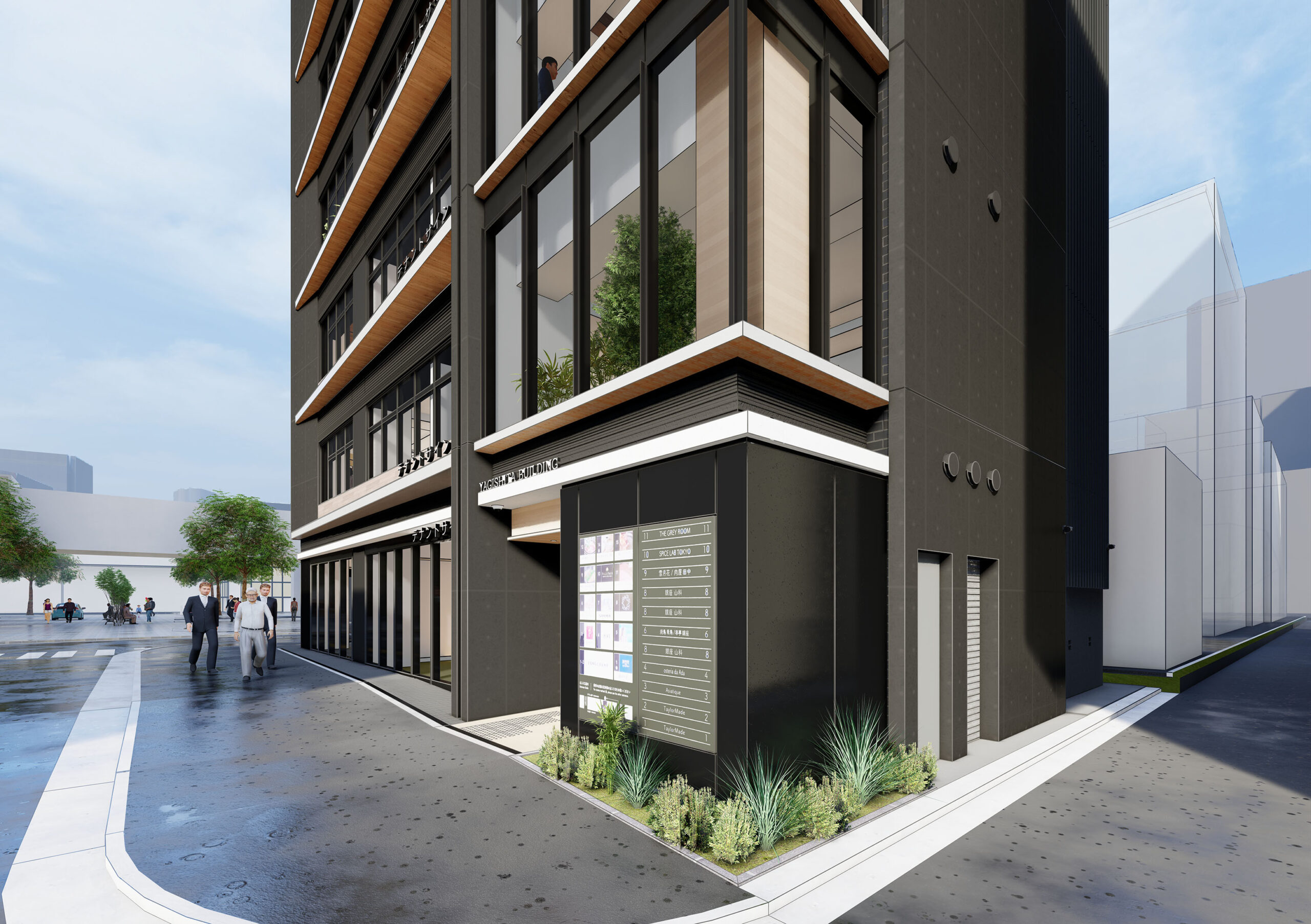 こうした変化の最前線に位置する本計画は、街の転換点における“最初の一手”となる建築として、周辺の将来像に道筋を示すとともに、関内・横浜の歴史的文脈を読み解くことを重視した。かつて港町として栄えた横浜の風景や文化を背景に、建物全体のテーマを“FLAGSHIP(旗艳)”と設定。変化する都市の海原に向けて船首を切り開く象徴的な存在として、力強いラインと傾斜面を用いたファサードをデザインした。隅切形状を活かして駅側に開く低層部は、歩行者の視線の流れを導く「舳先」のような表情とし、未来の再開発後にも街並みと調和する柔軟な立面構成としている。