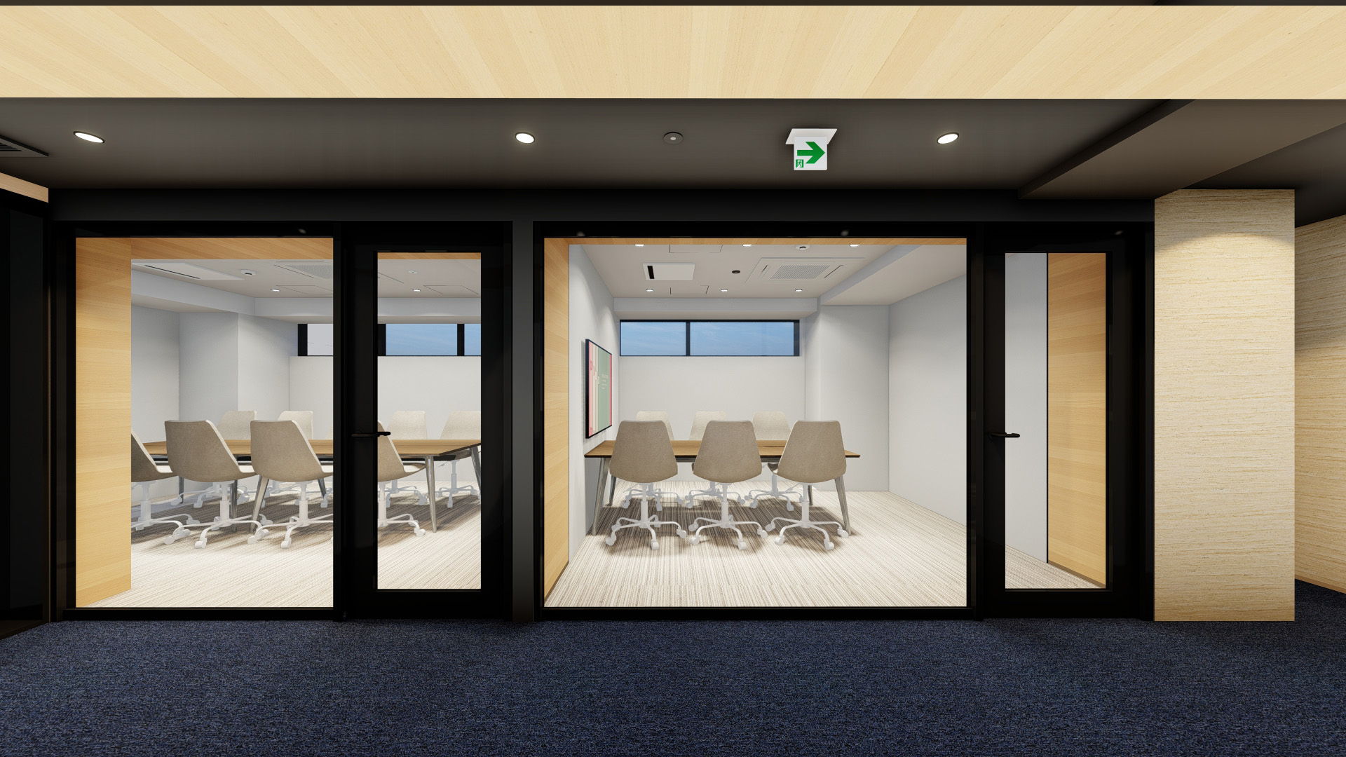 会議室は、利用頻度や利用人数に合わせて10人用・6人用・4人用の3タイプを計画。それぞれ最適なレイアウトと収納・モニター配置を行うことで、ムダなく使い勝手の良い空間としている。小規模打合せからクライアント対応まで幅広く対応でき、効率的なワークスタイルを実現する構成としている。