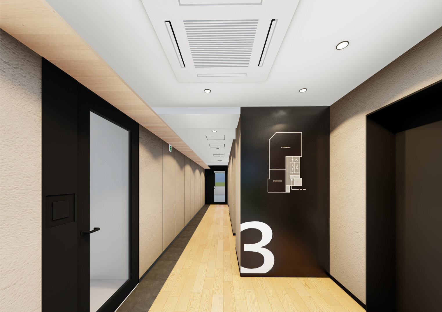 ラウンジとエレベーターホールは大型のガラスパーティションで緩やかに分節し、壁面緑化・床材・天井ラインを連続させることで、単なる動線空間を超えた広がりを生み出している。視線の抜けと素材の統一によって、ラウンジの価値をそのままホールに延長させ、共用部全体の質感を高めている。