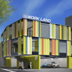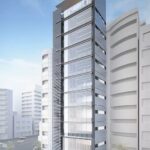 本計画は、JR関内駅前で進む三つの再開発プロジェクトに隣接し、今後大きく都市構造が変化していくエリアに建つ複合ビルである。敷地は駅前広場に向かって隅切られる特徴的な形状を持ち、関内駅からの主要な視線を受け止める“顔”としてのファサードを形成している。さらに、周辺では数年内に大規模な建替えや基盤整備が予定されており、将来的に建物に求められる正面性や外向きの方向が変化していく、極めてダイナミックな都市環境に立地している。