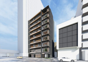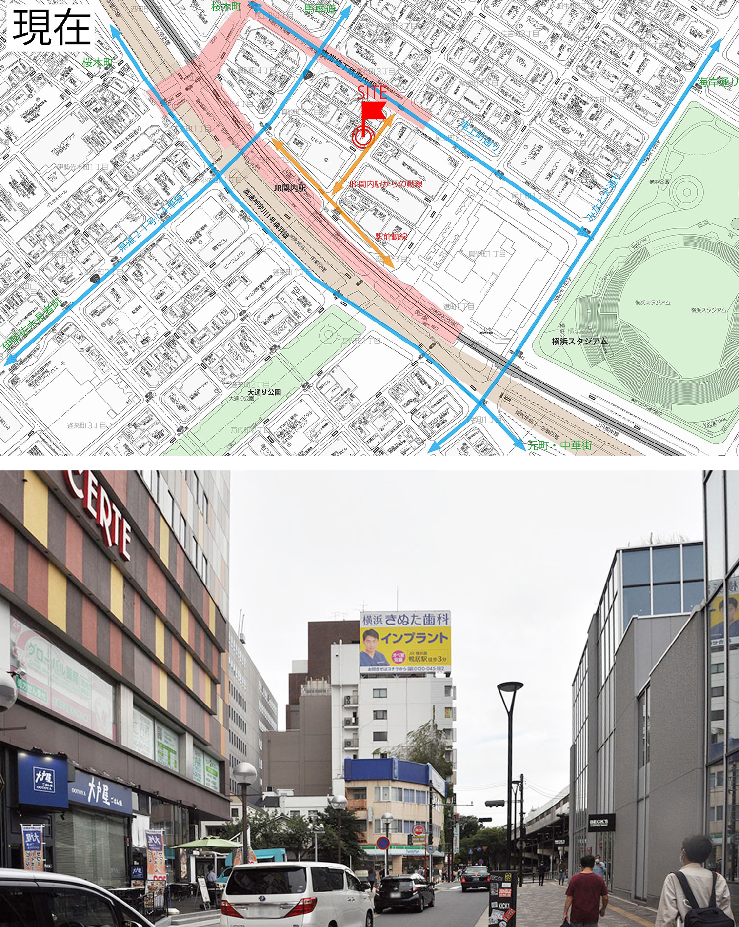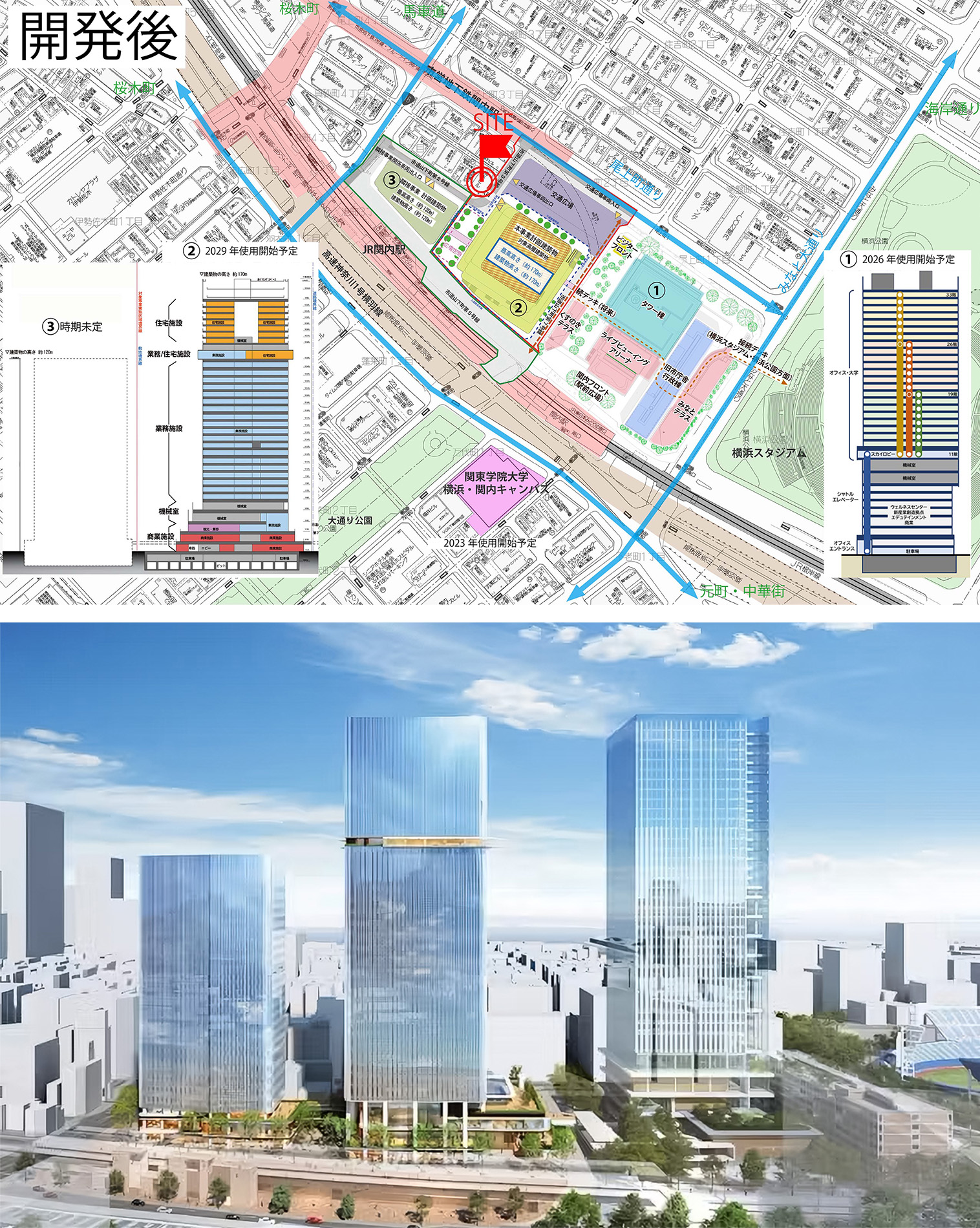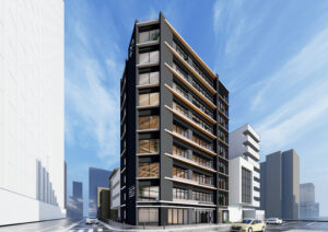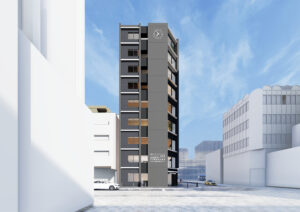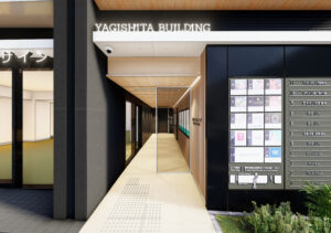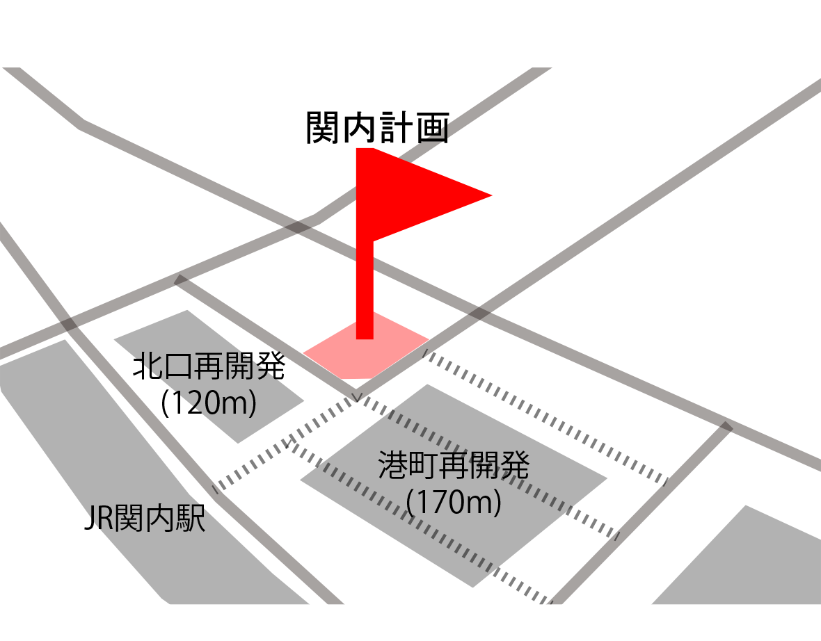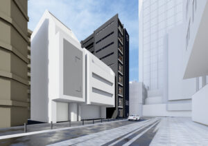 本計画は、JR関内駅前で進む三つの再開発プロジェクトに隣接し、今後大きく都市構造が変化していくエリアに建つ複合ビルである。敷地は駅前広場に向かって隅切られる特徴的な形状を持ち、関内駅からの主要な視線を受け止める“顔”としてのファサードを形成している。さらに、周辺では数年内に大規模な建替えや基盤整備が予定されており、将来的に建物に求められる正面性や外向きの方向が変化していく、極めてダイナミックな都市環境に立地している。