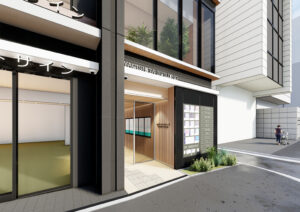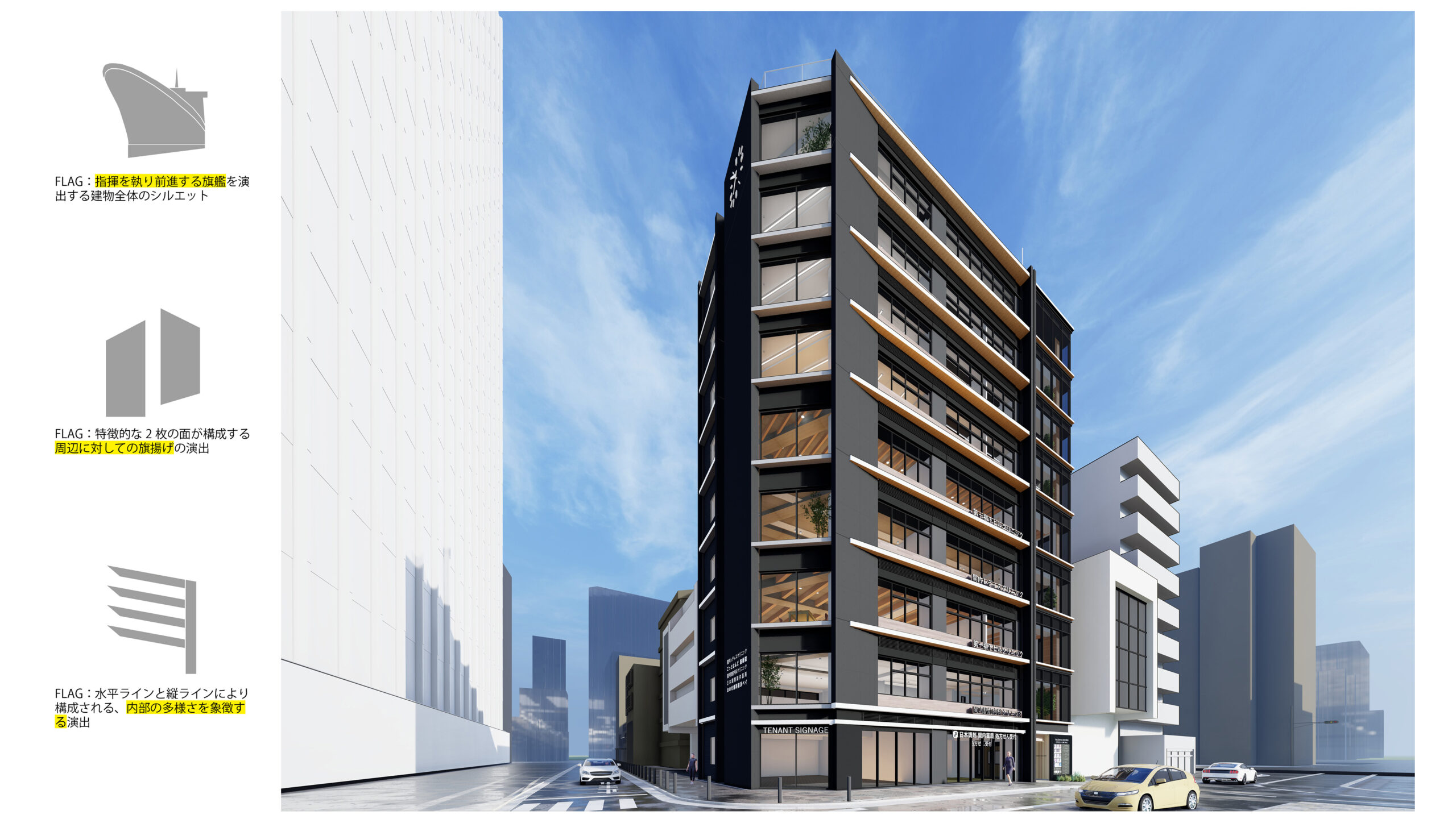 こうした変化の最前線に位置する本計画は、街の転換点における“最初の一手”となる建築として、周辺の将来像に道筋を示すとともに、関内・横浜の歴史的文脈を読み解くことを重視した。かつて港町として栄えた横浜の風景や文化を背景に、建物全体のテーマを“FLAGSHIP(旗艳)”と設定。変化する都市の海原に向けて船首を切り開く象徴的な存在として、力強いラインと傾斜面を用いたファサードをデザインした。隅切形状を活かして駅側に開く低層部は、歩行者の視線の流れを導く「舳先」のような表情とし、未来の再開発後にも街並みと調和する柔軟な立面構成としている。