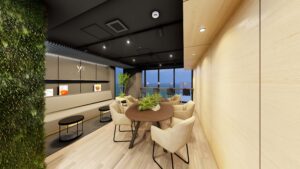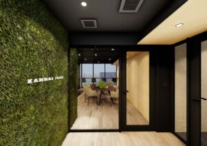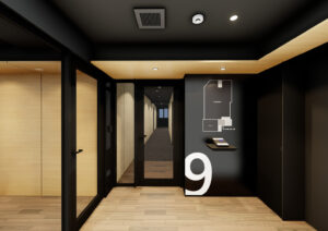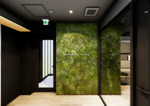 ラウンジとエレベーターホールは大型のガラスパーティションで緩やかに分節し、壁面緑化・床材・天井ラインを連続させることで、単なる動線空間を超えた広がりを生み出している。視線の抜けと素材の統一によって、ラウンジの価値をそのままホールに延長させ、共用部全体の質感を高めている。