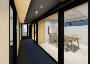 最上階には、入居テナントが自由に利用できるラウンジを配置した。ランチや休憩のためのリラックス空間であると同時に、気軽なワークスペースや来客対応にも利用できる柔らかな環境を整備している。眺望を最大限に取り込み、都市の変化を“見晴らす場所”として広がりのある空間構成とした。利用シーンの多様化に応える、ビル全体の価値を高める上質な共用ラウンジである。