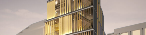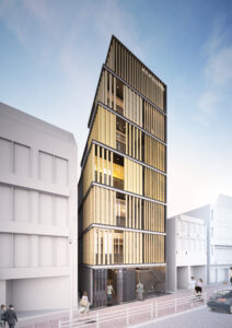 駅前のファサードは、ルーバーによる粗密で街との距離感を繊細に調整している。通りに近い部分ほどピッチを詰め、視線を受け止める層をつくり、上階に向かうにつれて間隔を広げて内部の光をにじませる。その濃淡のグラデーションが、平坦な立面にリズムを与えると同時に、段状のアイストップとして歩行者の視線をゆるやかに引き留める。