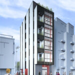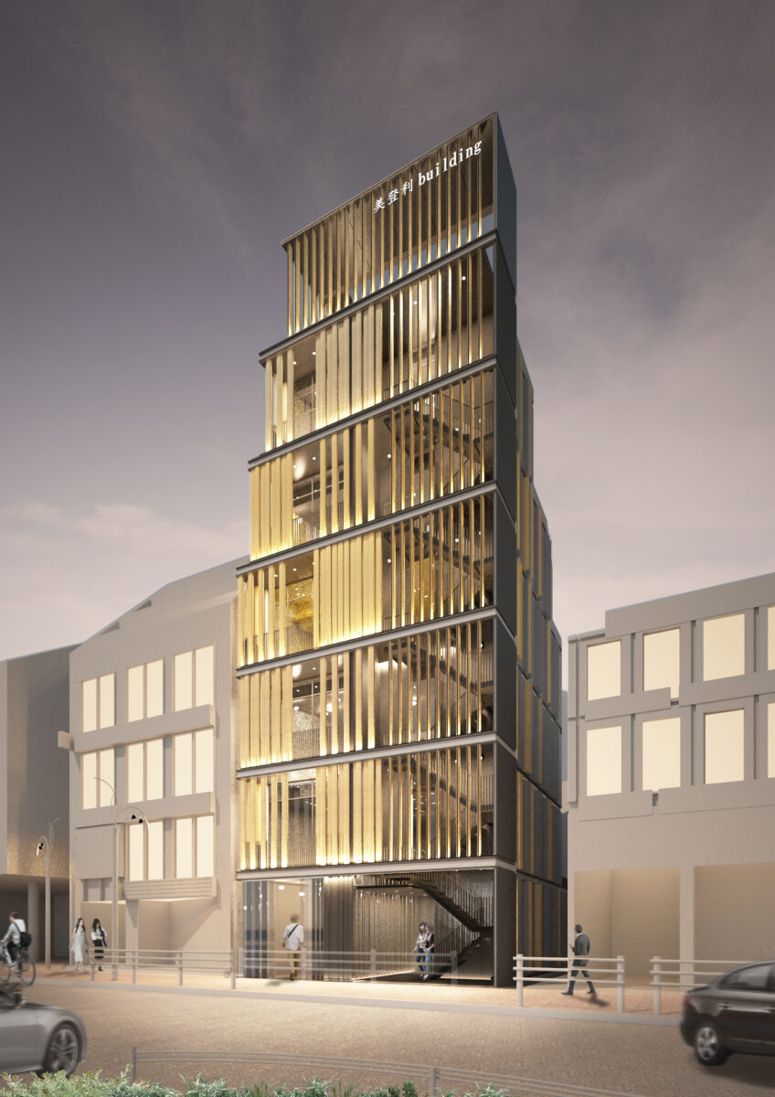 階段に沿って折れ上がるラインは、動線を示すサインであり、夜には光の階段として浮かび上がる。機能としての日射遮蔽やプライバシー確保を満たしながら、粗密と段差だけで「ここから先は特別な場である」と駅前の喧噪にささやく、静かなゲートをつくり出している。