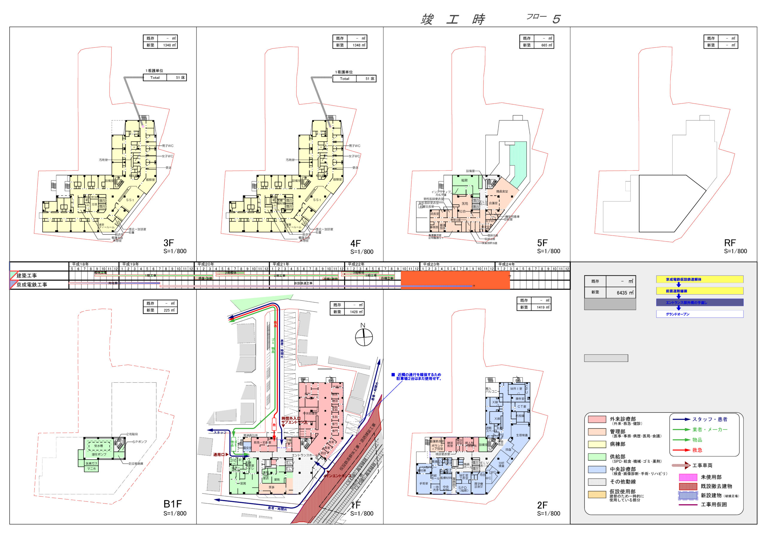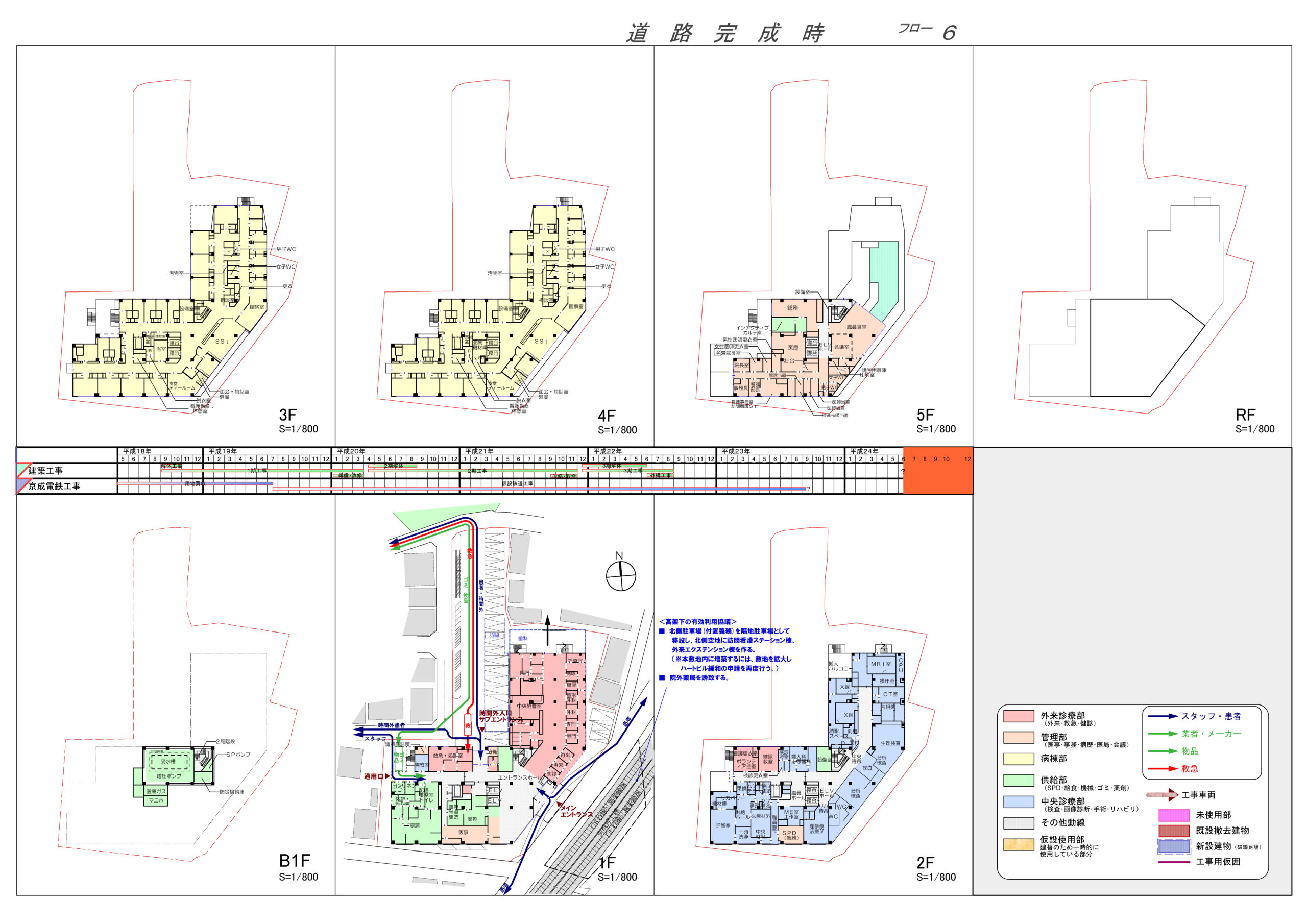 各建設段階では、その時点で求められる医療行為の流れや部門間の関係性を丁寧に読み解き、診療の質や安全性を損なうことのない環境を確保することを重視した。既存棟と新棟が一時的に併存する期間においても、利用者に混乱を与えない明快な構成とし、スタッフの業務負荷が過度に増大しないよう配慮している。