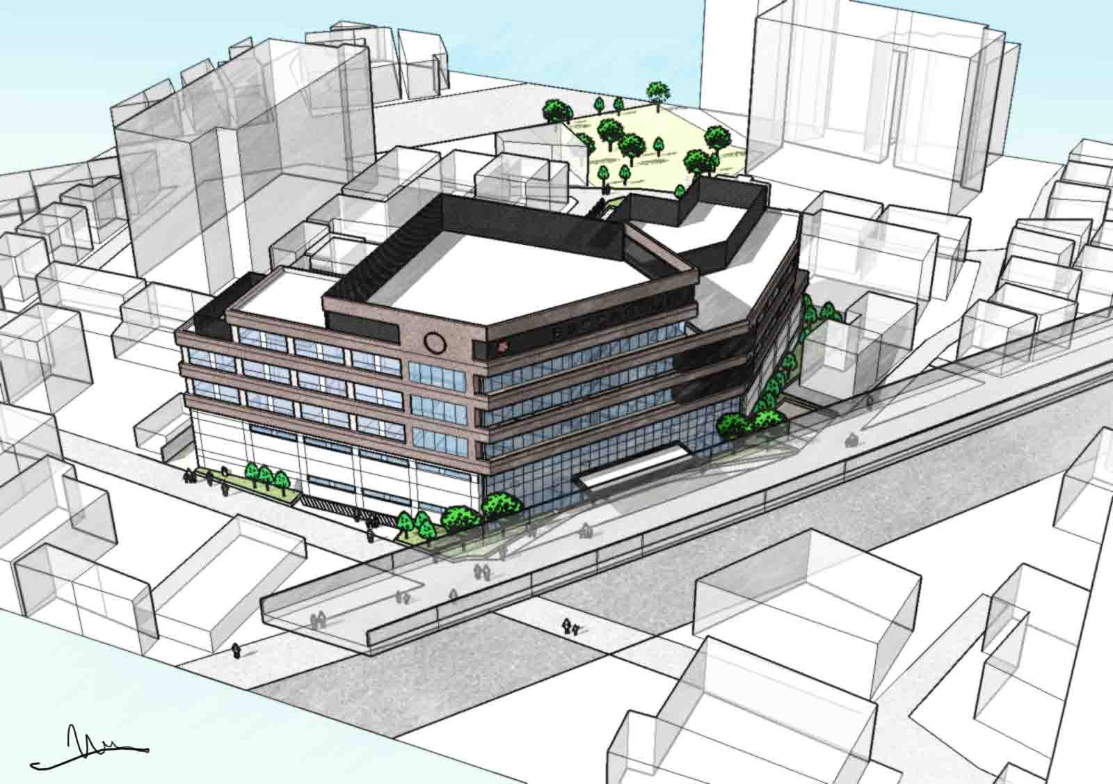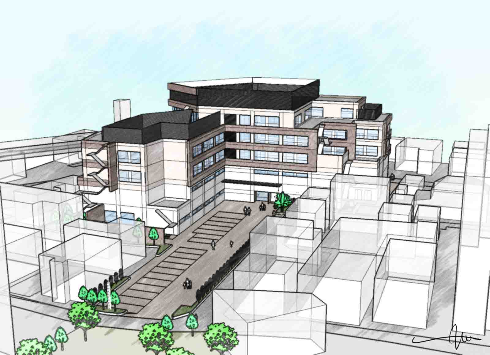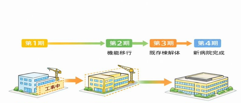既存病院の診療機能を一切停止させることなく、約4年という長期にわたって段階的に建て替えを行うことを前提とした病院再整備のコンペ案である。医療体制の継続を最優先条件とし、新棟の建設と既存棟の活用を並行させながら、各フェーズで必要となる診療機能を途切れなく維持する計画とした。工事期間中における患者・医療スタッフ・搬送動線が交錯しないよう、仮設を含めた動線計画を精緻に検討し、機能移行のタイミングについても段階ごとに明確に整理している。