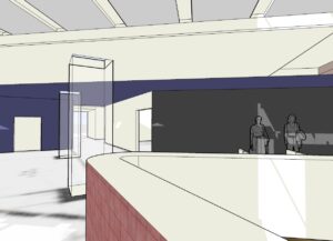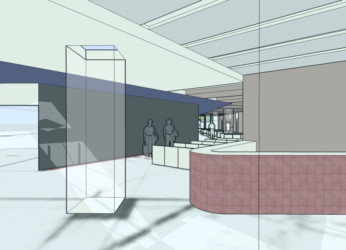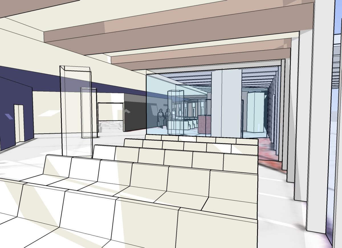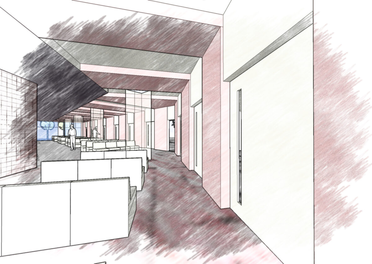 外来患者が最初に接する受付から待合空間にかけて、視線と動線が自然につながる内装計画としている。カウンターや間仕切りは高さや配置を整理し、受付機能を明確に示しながらも、空間全体に圧迫感を与えない構成とした。奥へと視線が抜けるレイアウトにより、来院者が現在位置や進行方向を直感的に把握できるよう配慮している。素材や色調は過度な装飾を避け、落ち着いたトーンで統一することで、医療施設に求められる清潔感と安心感を確保した。段階的な建替え期間中においても、診療動線の切り替えに柔軟に対応できる内装計画とし、利用者・スタッフ双方にとって使いやすい空間を目指している。
