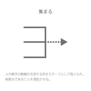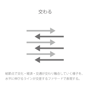 人や都市の動線が合流する文化・経済・交通の融合を表現