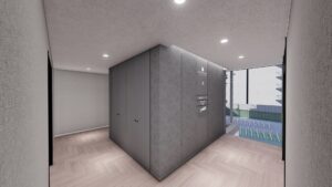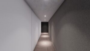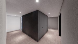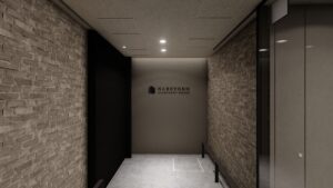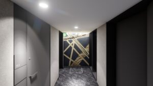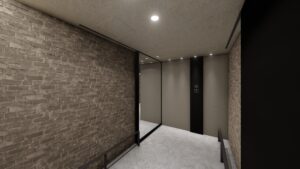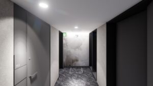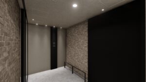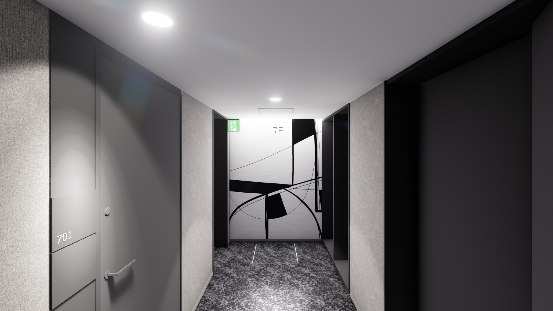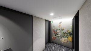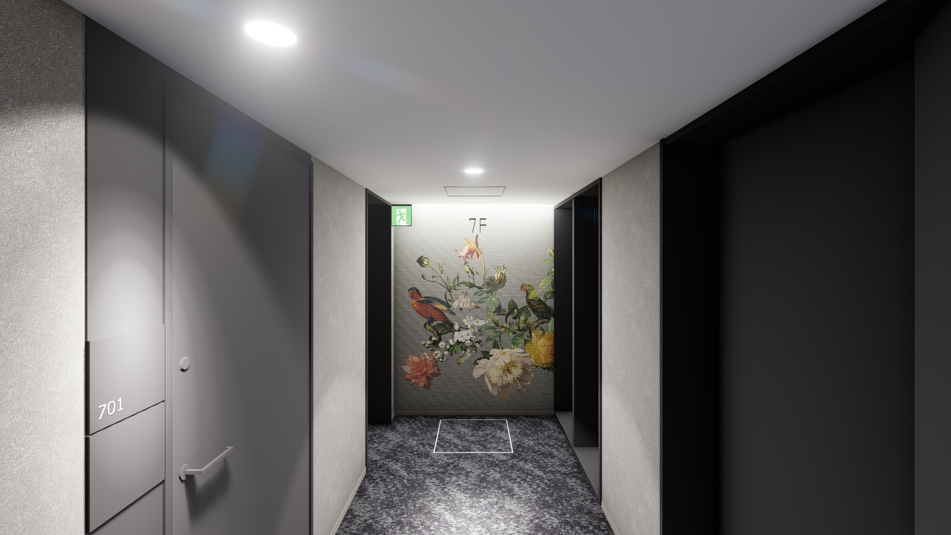 共同住宅の中廊下は、住まいへと向かう毎日の生活動線である一方、単調になりやすい空間でもある。本計画では、その通過空間に留まらない価値を与えるため、各階ごとに異なるアクセントウォールを設けた。エレベーターを降りた先に広がる壁面には、草花や鳥をモチーフとした意匠性の高い壁紙を配し、階ごとに異なる表情をもたせている。無機質になりがちな共用部に視覚的な奥行きと物語性を加えることで、住戸へと向かうひとときを穏やかに切り替える装置として機能させた。日常の中でふと目に留まる情景が、暮らしに小さな潤いと愛着をもたらすことを意図している。