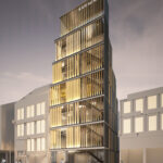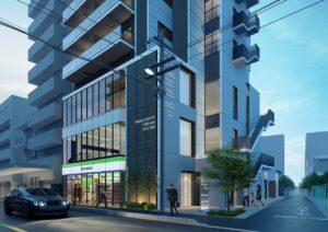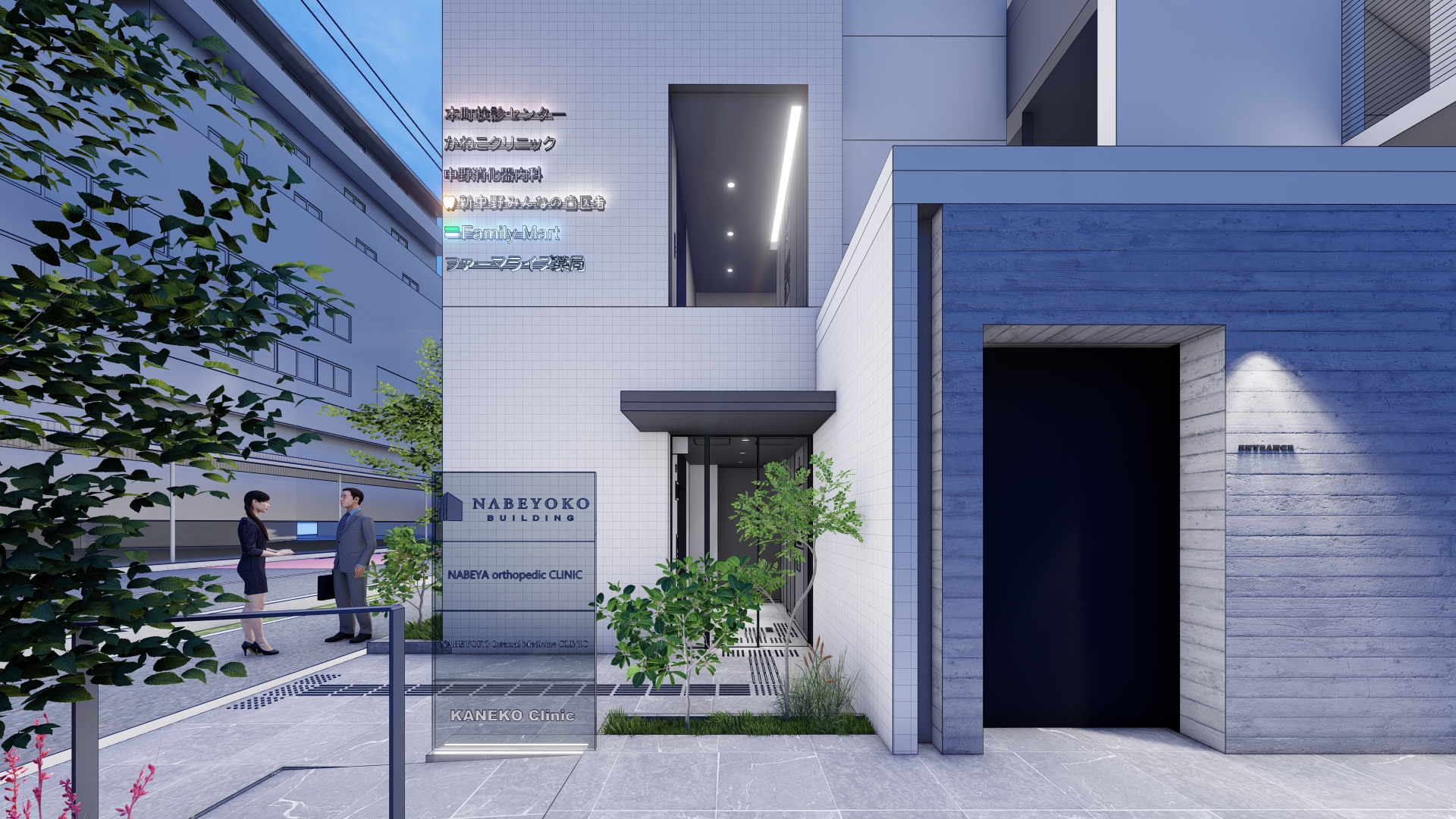 中野区・鍋横商店街に面して計画された本プロジェクトは、商業・医療・住居という異なる都市機能を積層し、街と建築の関係性を更新する複合建築である。1階には物販店舗を配置し、商店街がもつ日常的な賑わいを建築内部へと引き込み、通りの活性化に寄与する構成とした。2~3階には複数の診療科を集約したメディカルモールを計画し、来訪者が一か所で医療サービスを受けられる高い利便性を確保している。4~10階には賃貸集合住宅を配置し、低層部の賑わいから適度な距離を取ることで、静けさ・プライバシー性・眺望を兼ね備えた住環境を実現した。