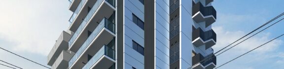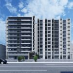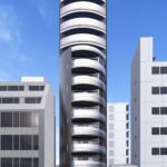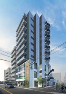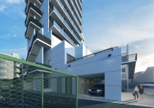 日影規制により上層部が大きく削られる敷地条件の中、その不整形なボリュームを弱点ではなく特徴へと転換するため、立面にはヴァーティカルフィンを配置し、縦方向の連続性で建物全体をまとめ上げた。これにより、規制形状を感じさせない端正で引き締まったファサードを実現するとともに、都市的なシャープさを強調している。高層住戸のバルコニーは白いスラブラインを際立たせ、水平のリズムを強調することで、空へ抜ける軽快な表情をつくりだした。低層の商業部にはハイサッシを採用し、歩道との視線を柔らかくつなぐ透明性の高い表情を形成。街並みと調和しながら、建物の存在感を自然に際立たせている。
