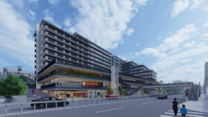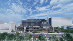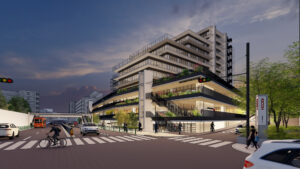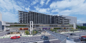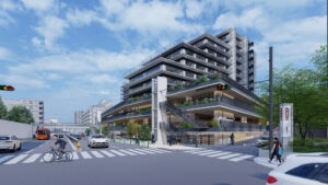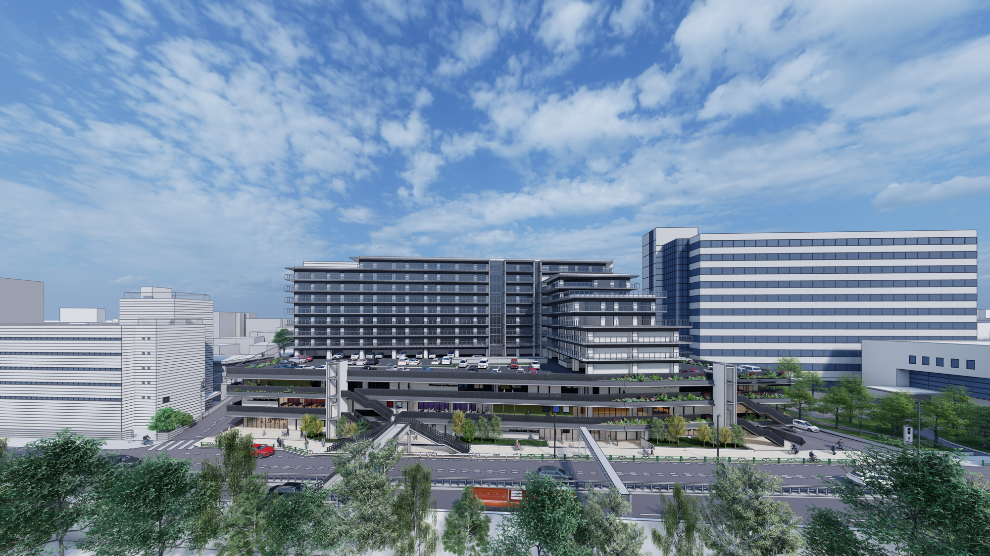 環状七号線の向かい側から見た全景であり、本計画が周辺のオフィスビル群と連続する中層スカイラインを形成している様子が分かる。左右に位置する既存リコーオフィスと高さとボリュームを揃え、中央に本計画を水平に架けることで、「Connection Bridge」というコンセプトを都市スケールで具現化している。環七側の低層部には商業施設と駐車場を積層させ、その上部に広い車路と緑化されたテラスを設けることで、幹線道路に面しながらも人が滞留できる外部空間を確保している。歩行者デッキは歩道橋と接続し、環七の両側を行き来する歩行者を建物内の商業ゾーンへ自然に導く装置として機能する構成である。背後の住宅地に対しては建物高さを段階的に抑え、街の縁辺を柔らかく切り替える役割も担っている。中央の駐車場フロアを基準面として、上層の住棟と下層の商業ゾーンをつなぐことで、異なる利用者の動線を整理しながら、立体的な回遊性を生み出している。街路樹の連なりとテラスの植栽が視覚的に重なり、季節の変化を感じられる緑の帯として環七沿道の景観に寄与する計画である。