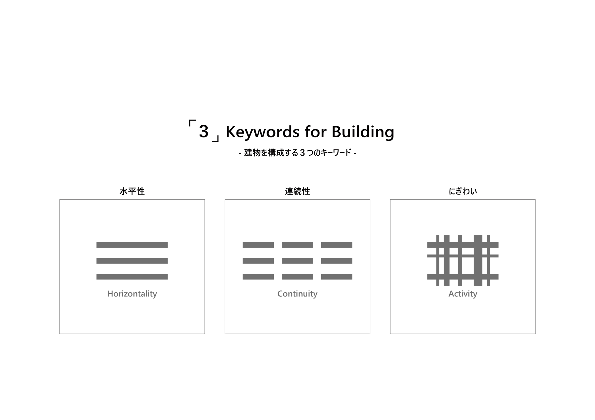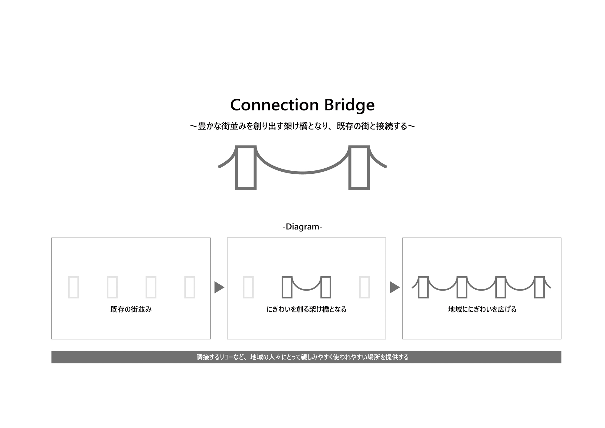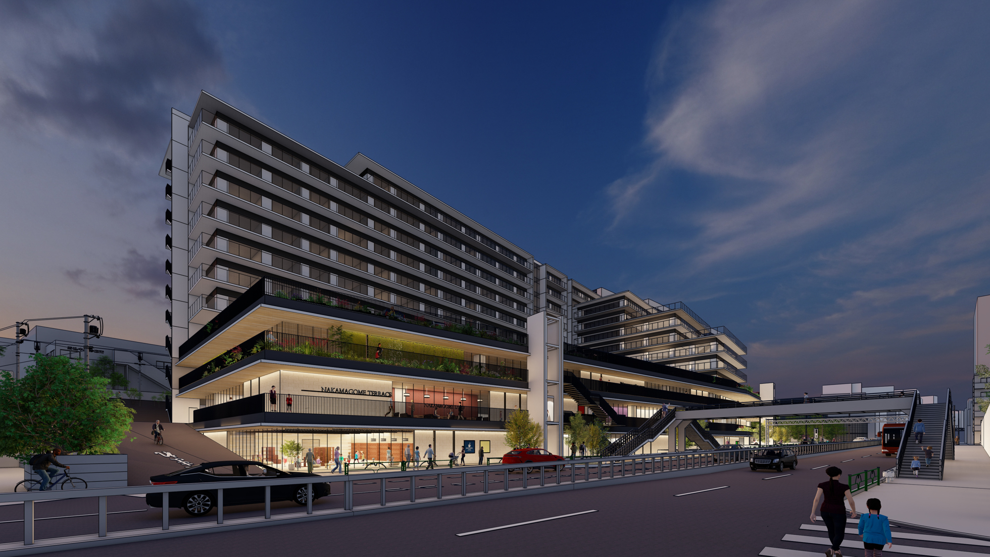 本計画は東京都大田区中馬込一丁目に位置する敷地面積6,440㎡の傾斜地に、店舗・サービス店舗・飲食店と共同住宅からなる地上10階地下1階、延べ約27,000㎡の複合施設を創出するプロジェクト。四方を道路に囲まれ最大約8mの高低差をもつ敷地条件を、単なる制約ではなく立体的な回遊性を生むポテンシャルと捉え、駐車場レベルを動線計画の軸とし、低層に街に開いた店舗、中層に駐車場、上層に静かな共同住宅を積層する断面構成とすることで、にぎわいと住環境の質の両立を図った。法規制から導かれるボリュームの変化は、あえて水平基調のファサードの中に段状のテラスや植栽帯として表現し、光と緑が連続するゆらぎのある輪郭へと昇華させた。外構計画では環状七号線側に都市的なプロムナードを、住宅地側には落ち着いた緑のテラスを設け、昼夜で表情を変える照明計画によって歩行者に安心感と賑わいをもたらす界面を創出した。さらに建物内外を貫くデッキや広場を配置することで、3つのキーワードである「にぎわい」「連続性」「水平性」を空間として具体化した。「Connection Bridge」をキーワードに、オフィス街と住宅地、幹線道路と生活道路、働く場と暮らす場をやわらかくつなぐ、新しい都市の架け橋となる計画を提案した。