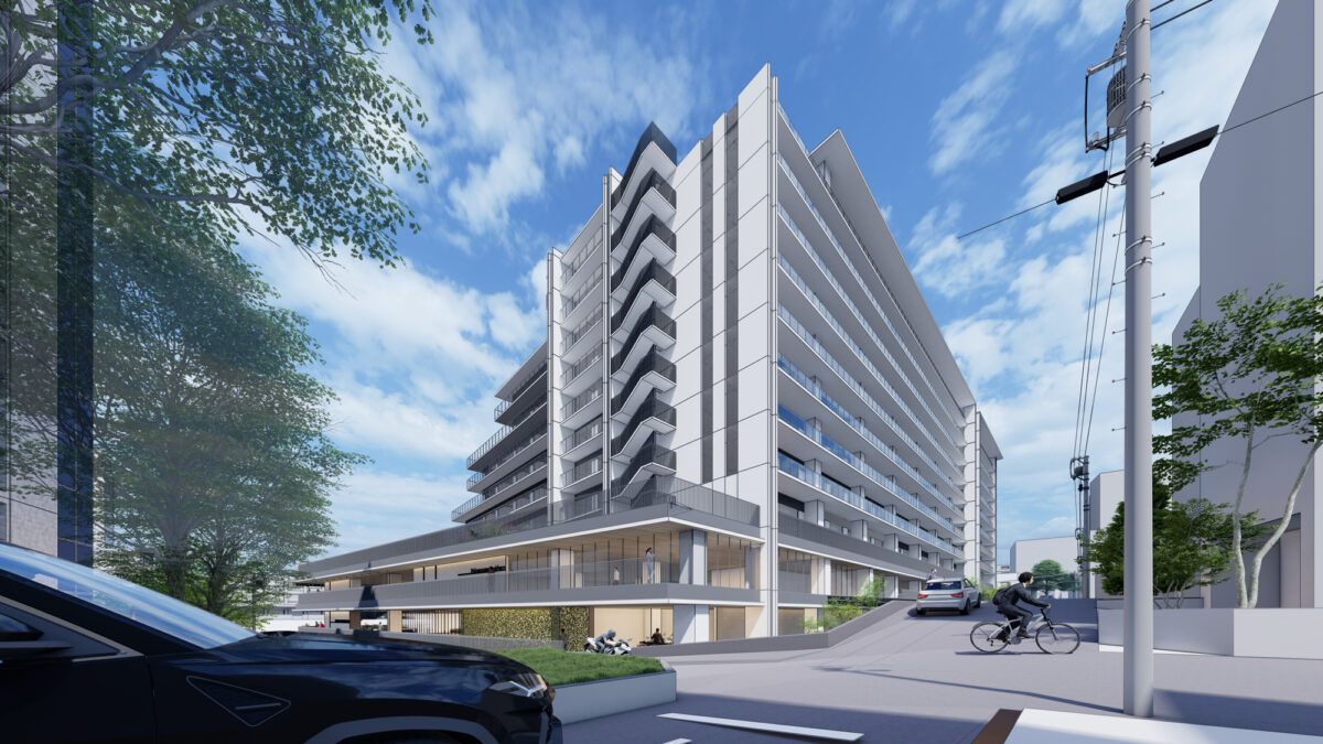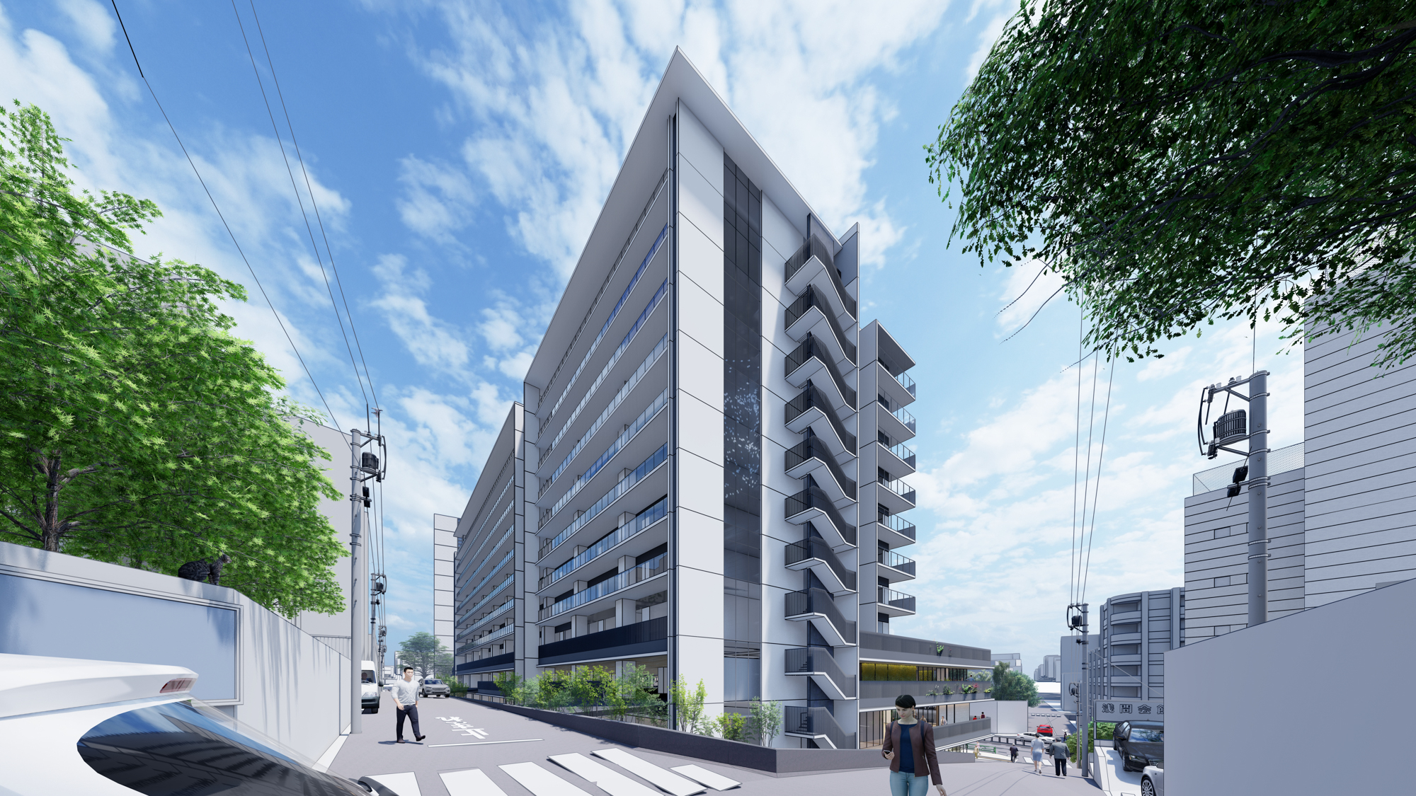 計画地の南西側コーナーから見た外観であり、スロープ状の道路に沿って基壇と住棟が立体的に連続していく様子を捉えている。低層部はセットバックしたガラスのボリュームとし、その下に駐輪場やバイク置場、サービス動線を収納することで、街路レベルからの圧迫感を軽減しつつ、生活機能をコンパクトに集約している。上部の住棟は細い水平マリオンと連続バルコニーによって構成し、角度を振ることで街路に対してやわらかな正面性をつくり出している。歩行者・自転車・自動車の動線が交差するポイントであるため、見通しの良いガラス面とピロティ状の抜けを確保し、安全性と開放性の両立を図っている。道路勾配に合わせて外構レベルを段状に処理し、植栽帯やベンチを挿入することで、通り抜けるだけでなく滞在も許容する街角のポケットスペースを計画している。住宅地側に対しては色彩とボリュームを抑え、背後の高層オフィスとの対比の中で、暮らしの場としての落ち着きと、環七側のダイナミックな表情をつなぐ緩衝帯となることを意図している。地域に開いた穏やかな外観である。