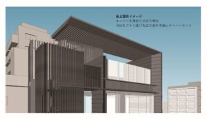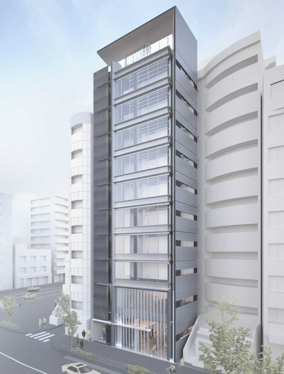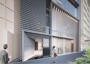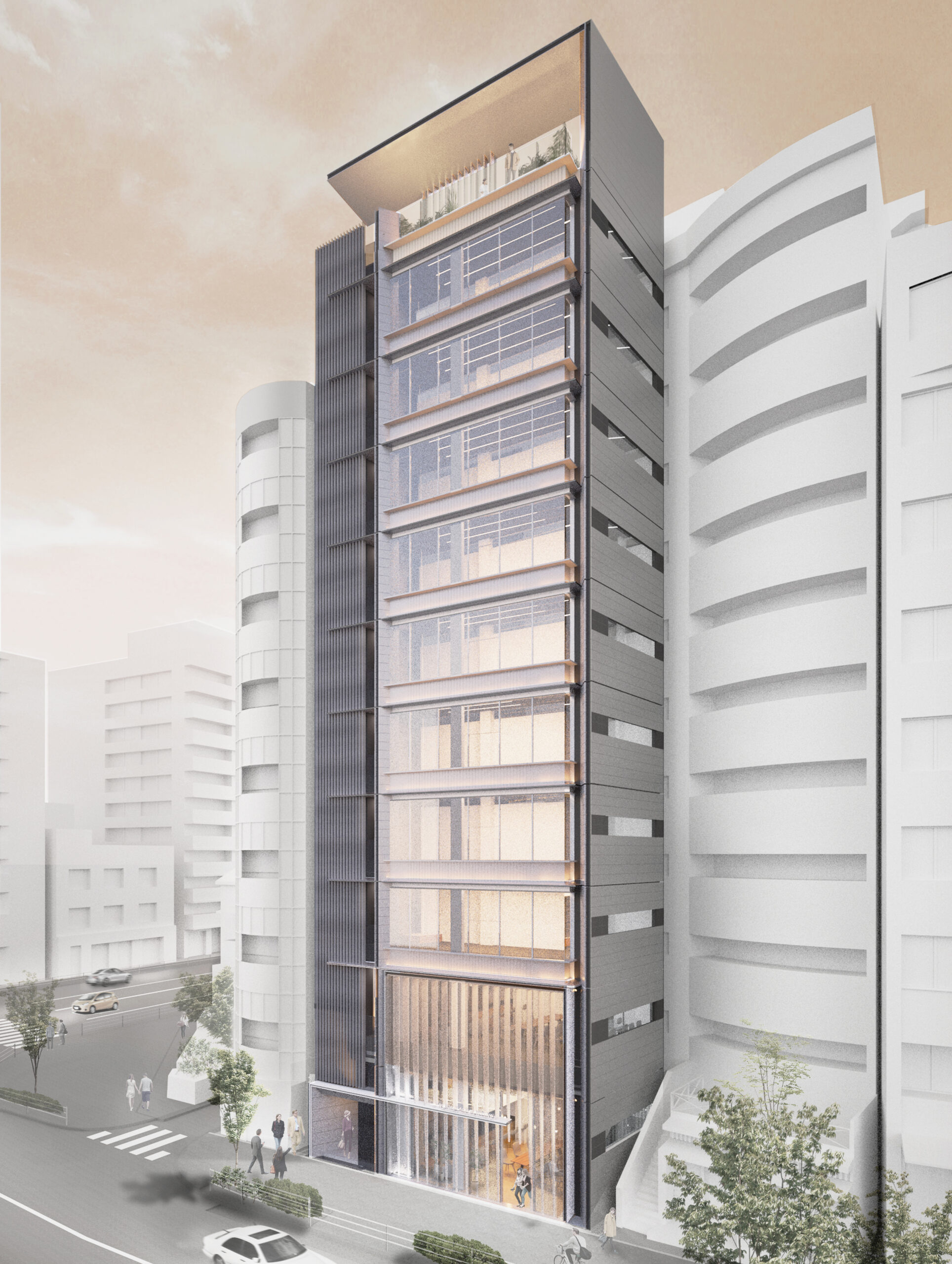 繊細な縦ルーバーが軽やかなスクリーンとなって街路との境界を和らげ、都心の喧騒を受け止めながらも、奥へと誘う開かれたエントランスを形づくる。各階に忍ばせたライン照明と、屋上をぐるりと縁取る光のフレームは、日没とともに静かに立ち上がり、ファサード全体を宙に浮かぶレイヤーのように輝かせることで、都市高速を行き交う視線に強い印象を刻む。来訪者を迎える足元には、温かみのある光と質感豊かな仕上げ材を重ね、硬質な都心の風景のなかにも、人のスケールで都市のうつろいを感じ取れる、細やかな表情を与えている。歩道を歩く人々は、ルーバー越しに漏れ出す光と気配に導かれ、内部へと自然に引き込まれる。建物は昼は控えめに街並みに溶け込み、夜は光の柱として周囲のビル群とは異なるリズムを都市に与えることを意図している。こうした光の演出により、一日の時間の移ろいとともに表情を変える、都市の新しい玄関口としての役割を担うことを期待している。