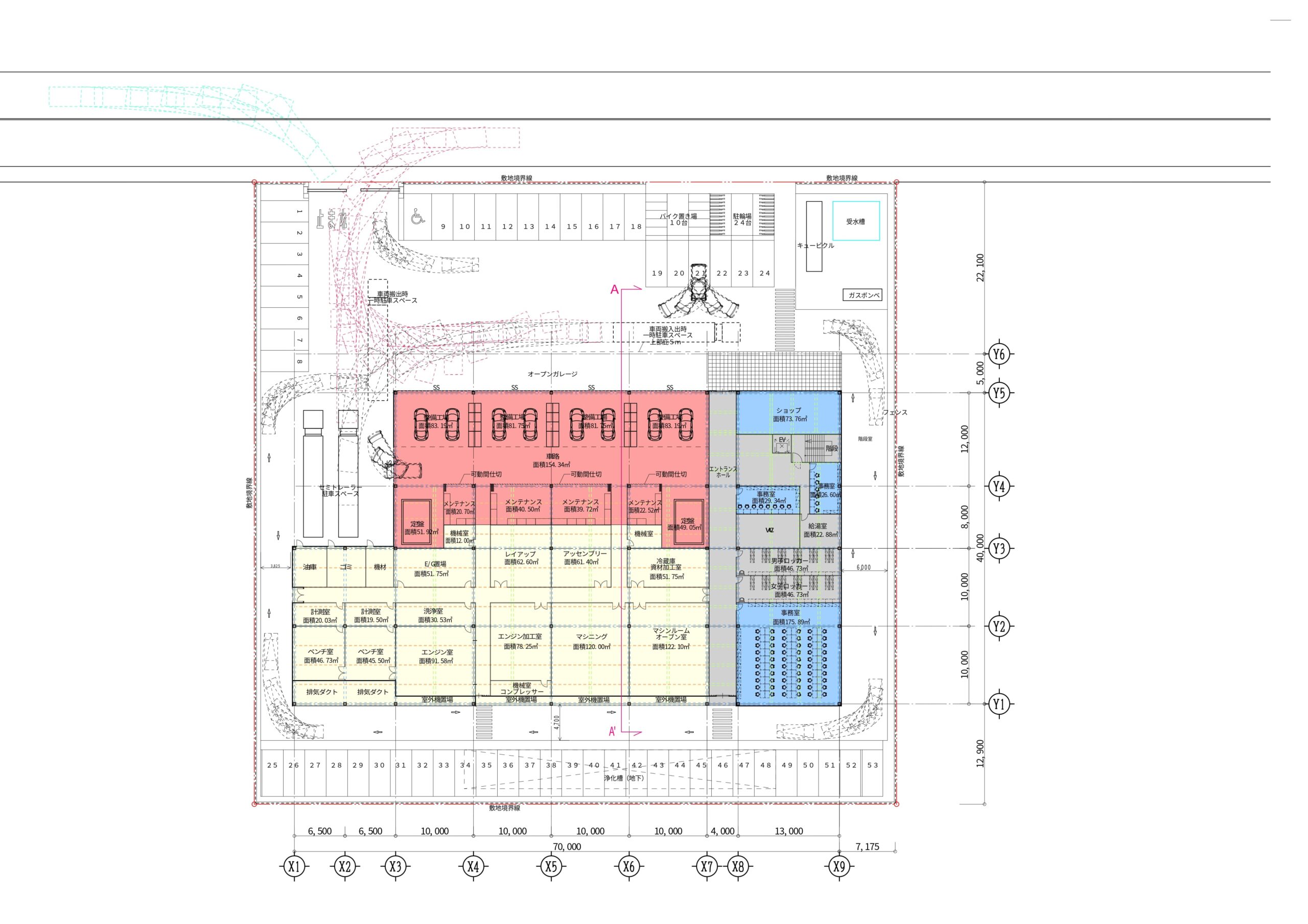 機能性と経済性を担保しつつ、モータースポーツ施設にふさわしい華やかさと象徴性を兼ね備えたオープンガレージの計画である。