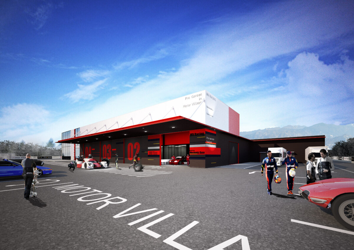 本計画では、レーシングカーのカラーリングやマーキングに見られる色調、数字、ラインといったグラフィック要素をモチーフとし、それらを建築およびサイン計画へと展開することで、モータースポーツ特有のスピード感や高揚感を表現している。