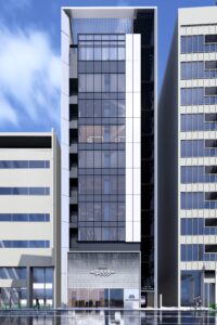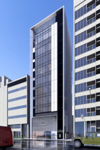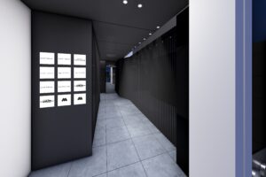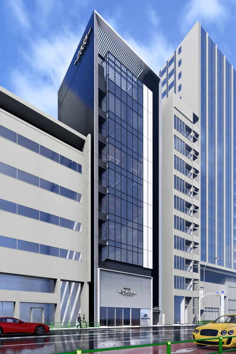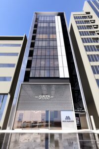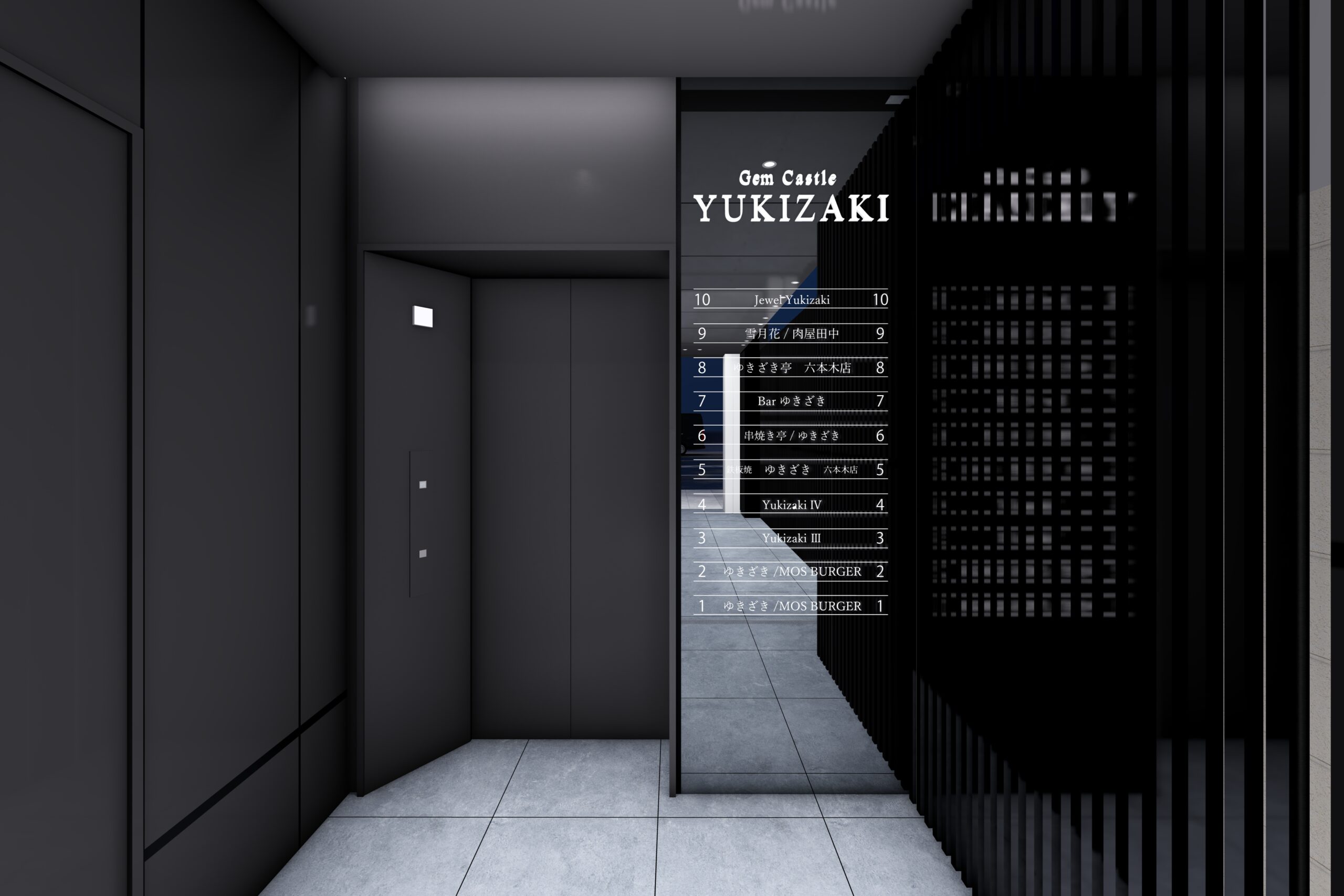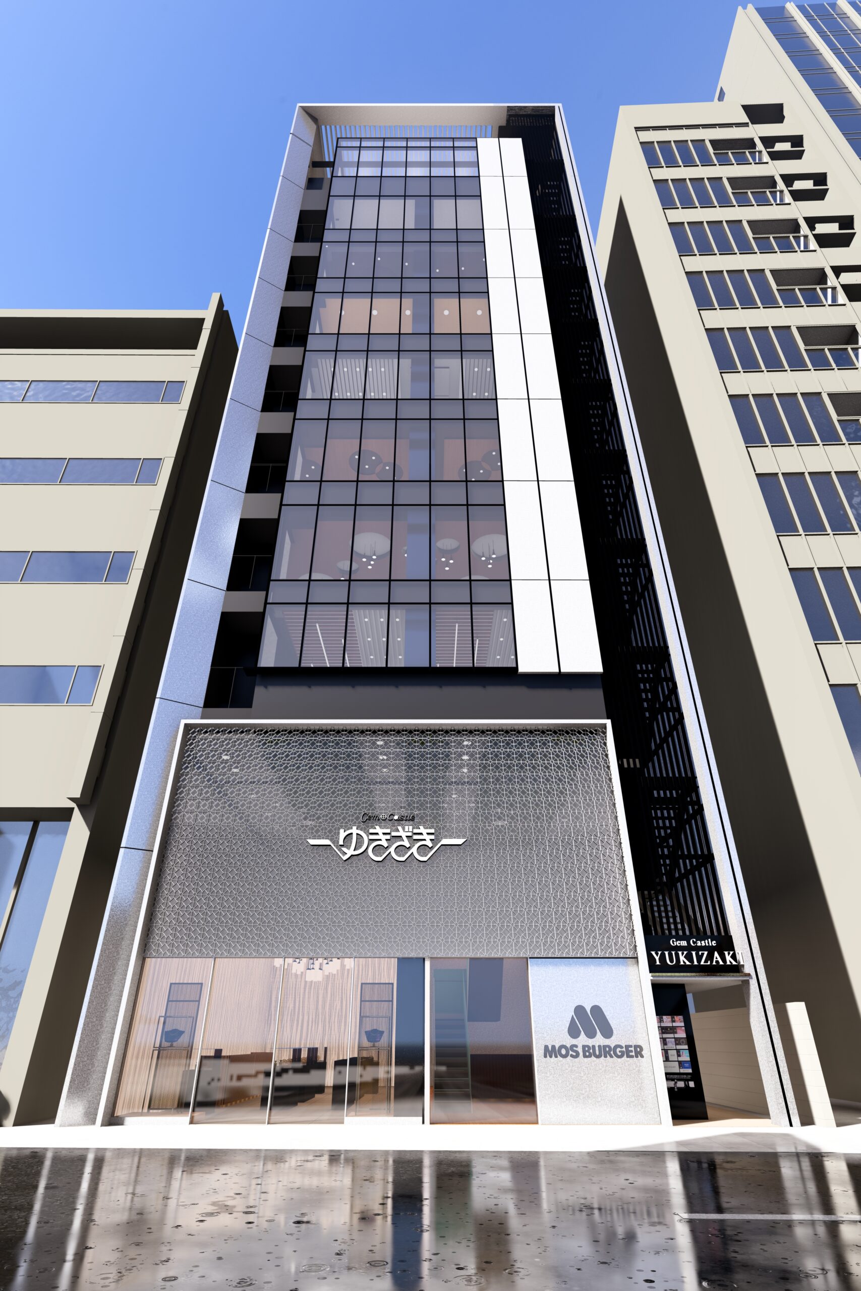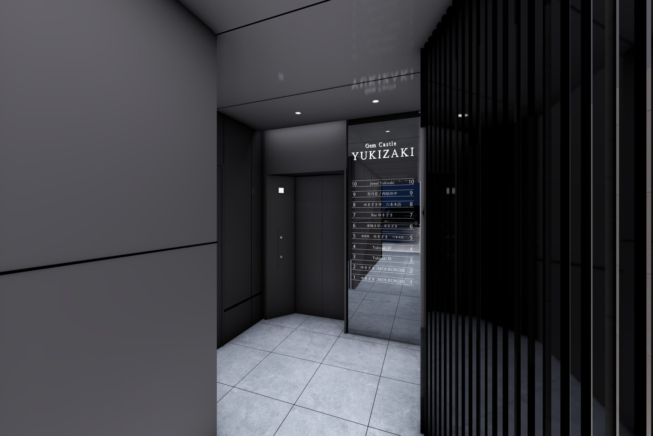 六本木交差点からほど近い立地に建つ宝石店のための商業ビルである。本計画では、スタイリッシュで洗練された外観を基調としながら、屋上の工作物と建築を一体的にデザインすることで、限られた敷地条件の中でも建物をより大きく、象徴的に見せる構成とした。外観は紺色と白色の二色によるコントラストで構成し、上品さと奥行きを演出するとともに、左右からも視認される敷地の特性を生かして、通りごとに異なる表情が立ち上がるファサードとしている。低層部には宝石店の家紋モチーフを抽象化して取り込み、街並みに溶け込みながらもブランドの存在感を静かに主張する構えとした。エントランスは黒を基調に、質感の異なるマテリアルを組み合わせることで、重厚感と緊張感を併せ持つ空間を形成し、訪れる人を宝石の世界へと導く導入部としている。テナントとして入る飲食店、宝石店、キャバレー等の様々な用途を整理し一つのまとまったデザインに昇華させた。