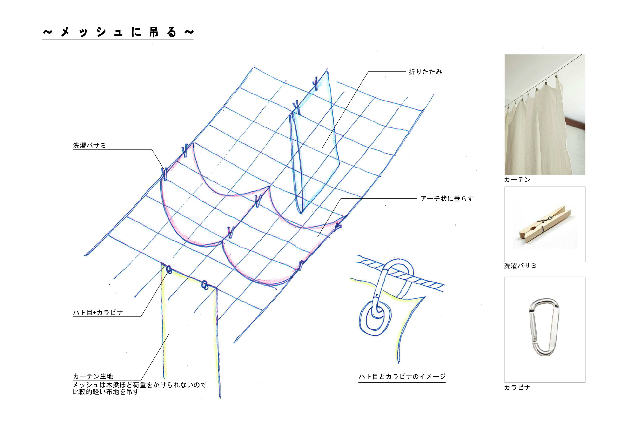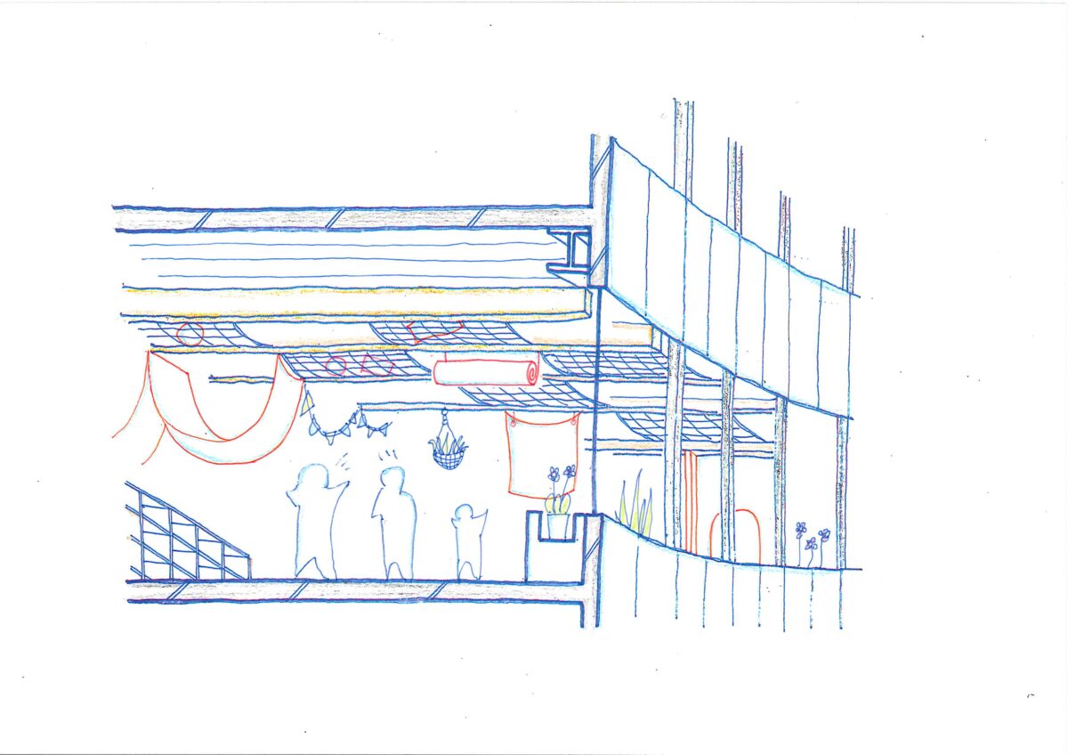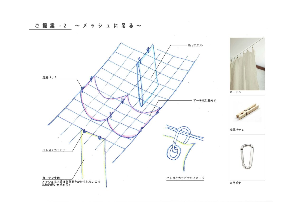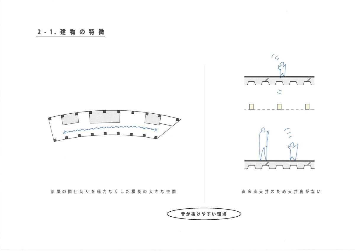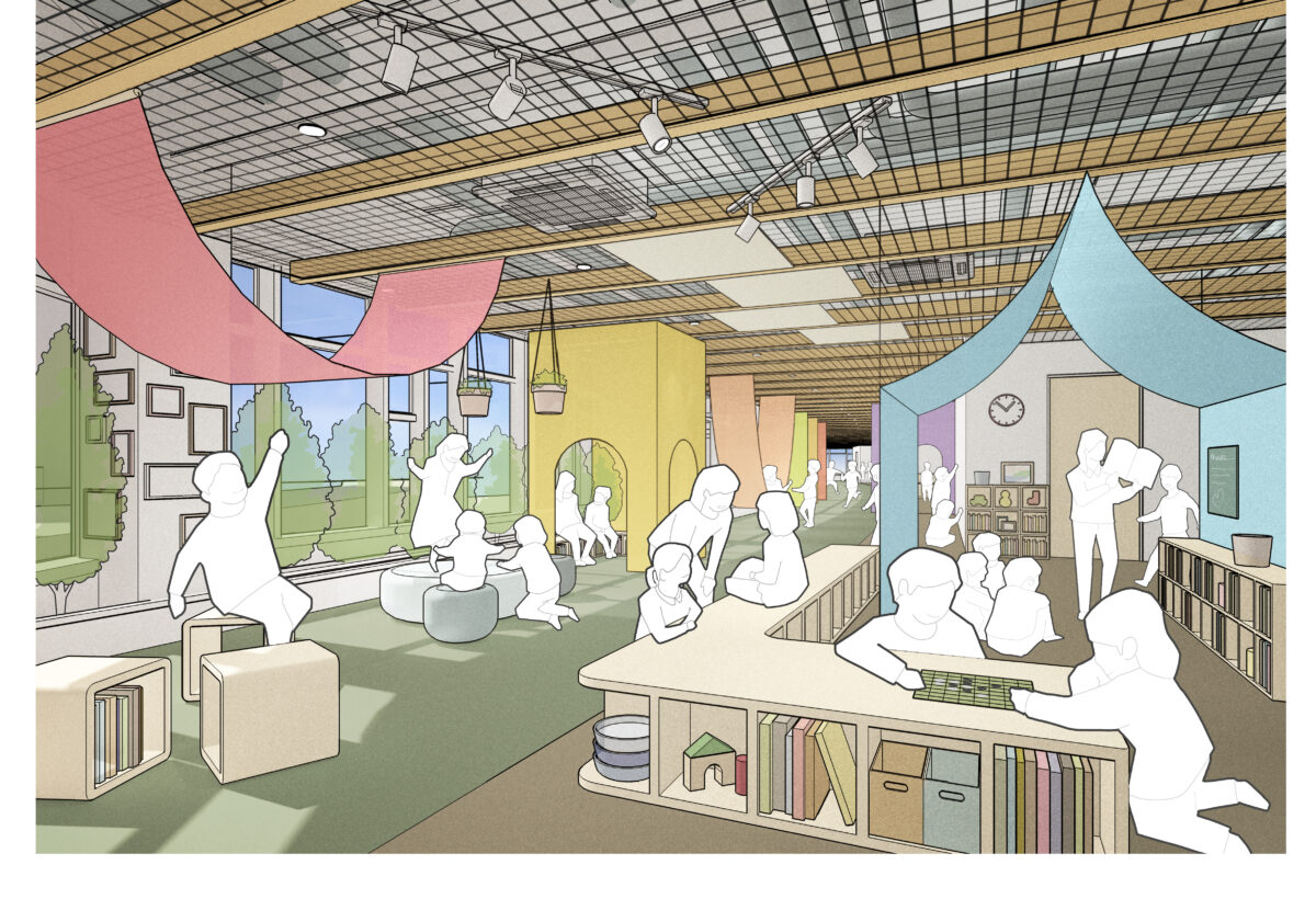 「旧駅舎を継承した細長い建物形状」「屋外の遊び場がつくれないこと」を、体格差や運動量の異なる0~5歳子供たちの居場所をどのようにしてつくり、様々な学びの空間にできるかということが主題となった。私たちは、「空中に浮いた保育園」をつくるというコンセプトを基に設計を行い、鉄骨3階建ての建物の天井に木梁を設け、温かみのある連続した空間とした。木梁には、幕を吊るして空間の分節や子供の年齢にあった天井高さの調整、子供たちの作品を飾るなど、木梁が細長い空間を3次元的に使う仕組みとなり、細長い室内空間の中に多様な空間を生まれることを期待して設計を行った。
