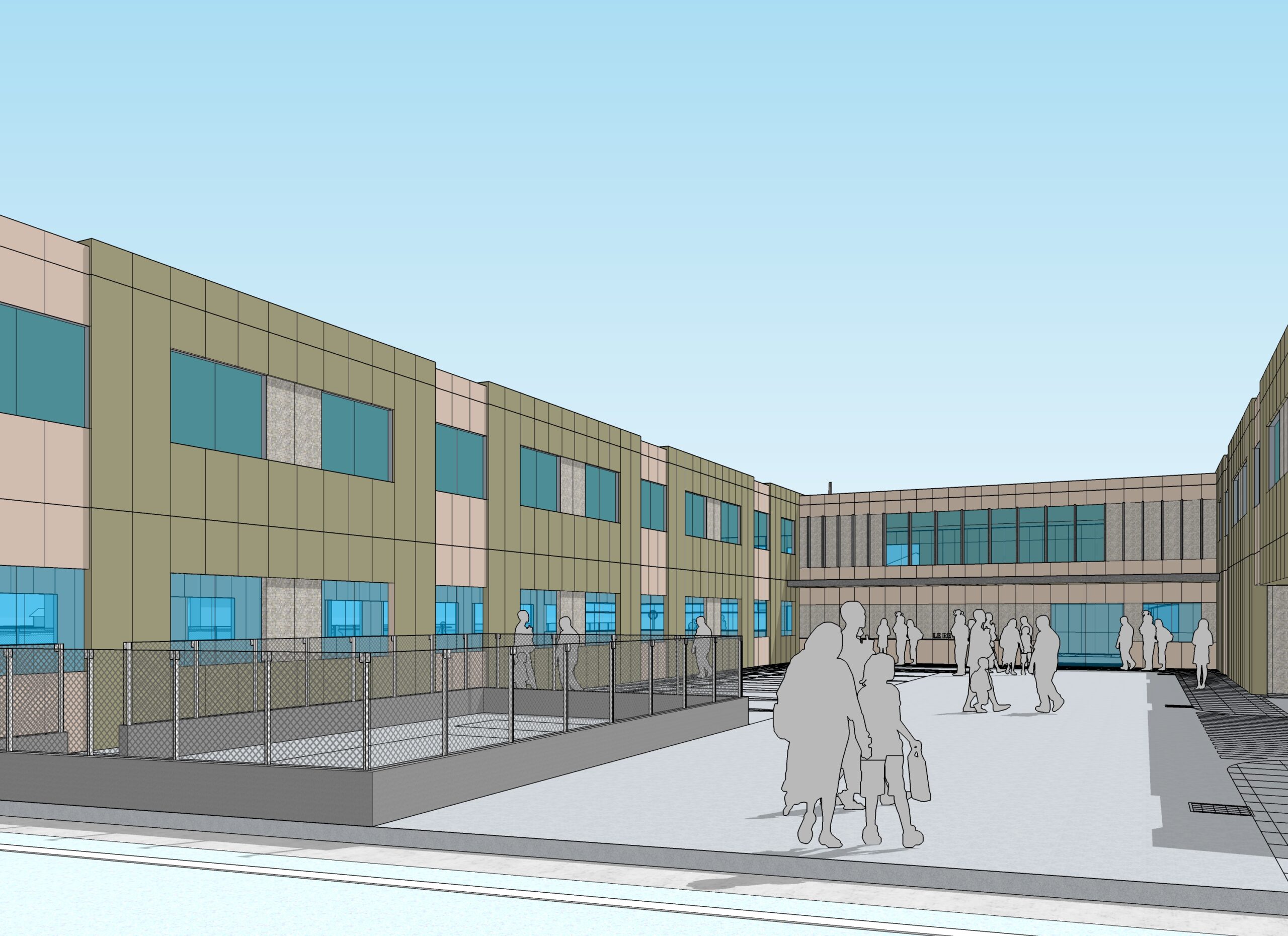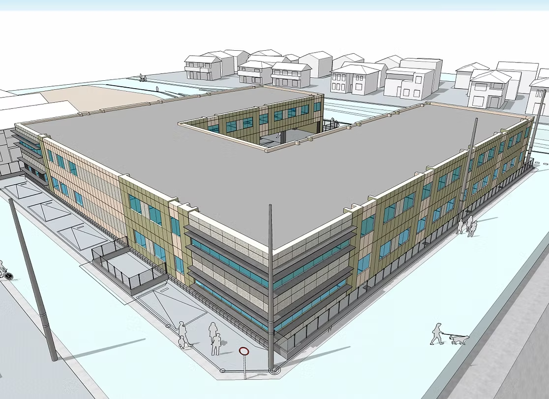 本計画は、街区の中に落ち着いた拠点を形成することを意図した、コの字型平面をもつ低層建築の提案である。建物を敷地外周に沿って配置することで、内部にはまとまりのある中庭空間を確保し、外部の喧騒から一歩距離を取った、穏やかな環境を生み出している。中庭は採光・通風を建物全体に行き渡らせるとともに、人の滞留や交流を促す共有の場として機能する。外観は水平ラインを基調としつつ、素材や色調に変化を持たせることで、長大なボリュームを分節し、周辺スケールに配慮した表情を与えている。1階部分には歩行者に近いスケール感を意識した開口や庇を設け、街路との連続性を高めた、地域に長く根付く建築となることを目指している。