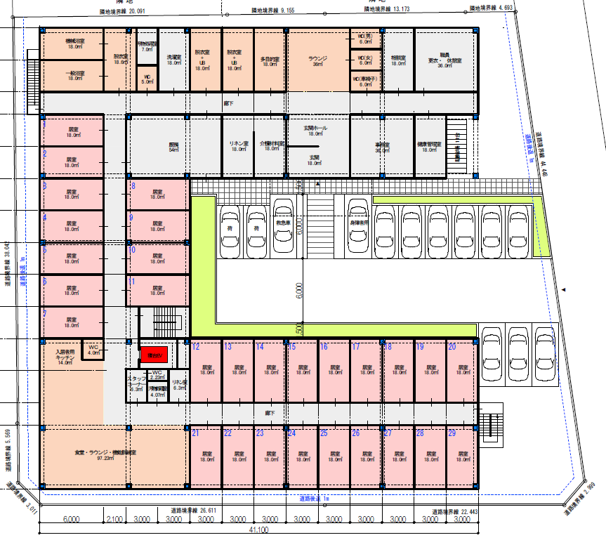 本計画は、サービス付き高齢者向け住宅(サ高住)として、安心と日常の豊かさを両立させることを目的にした回廊型の建築である。建物をロの字状に配置し、中央に中庭を設けることで、居住者が常に自然光や外気を感じながら生活できる環境を整えている。中庭は単なる空地ではなく、散策や立ち話、季節の移ろいを楽しむ場として、高齢者の日常行動をやさしく受け止める生活の核となる空間である。各住戸や共用部は中庭に向かって緩やかに開かれ、スタッフの見守りや居住者同士の気配を感じ取りやすい構成とした。外観は落ち着いた色調と水平性を基調とし、周辺環境に穏やかに馴染む佇まいを目指している。回遊性のある廊下計画により、無理のない動線と適度な運動量を確保し、安心・安全に配慮しながらも、自立した暮らしを尊重するサ高住としての住環境を提案している。