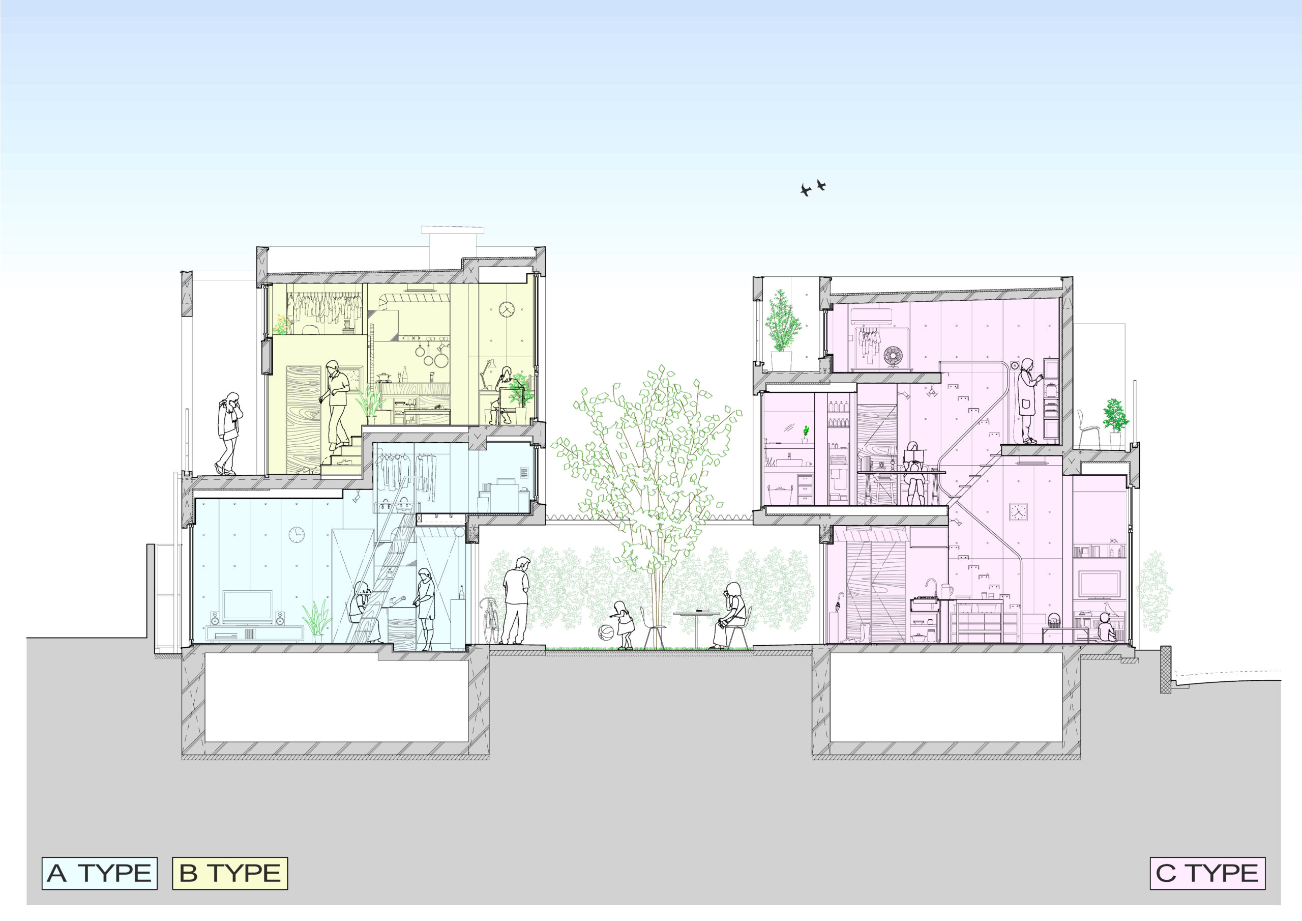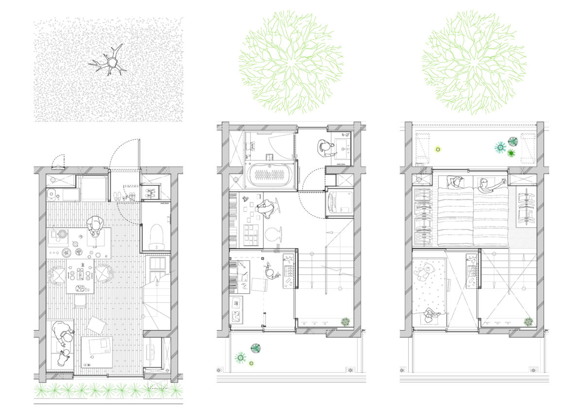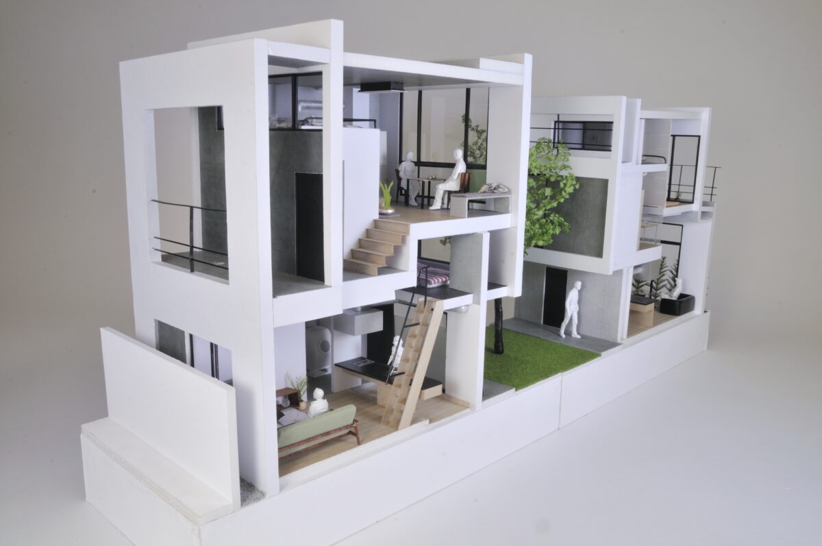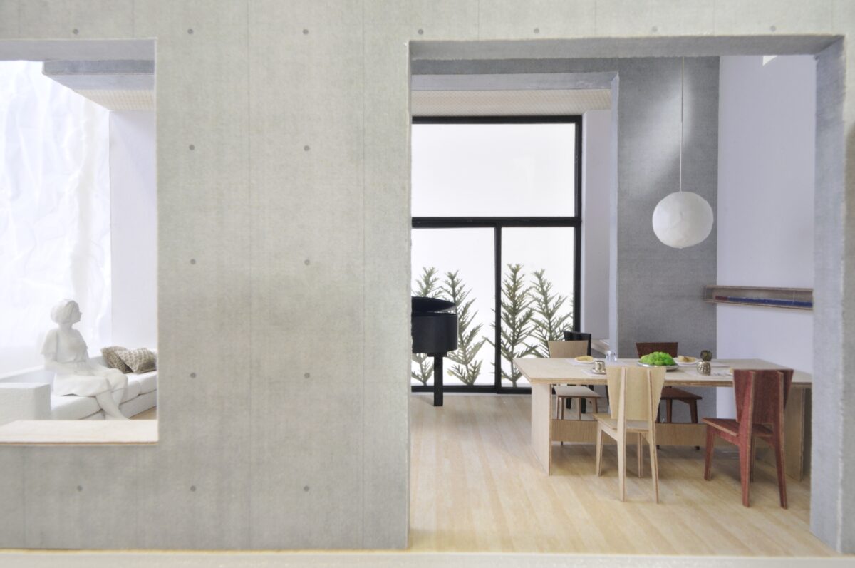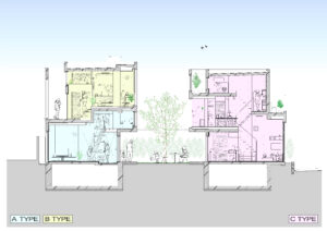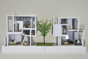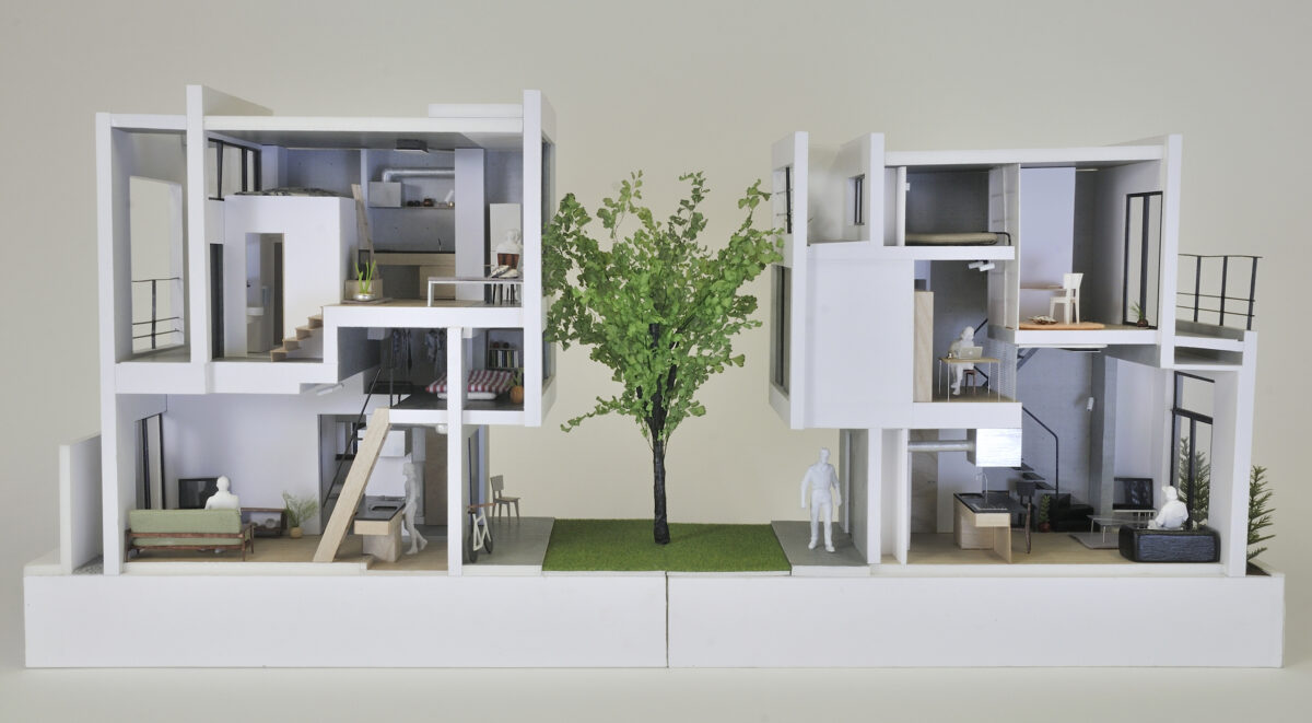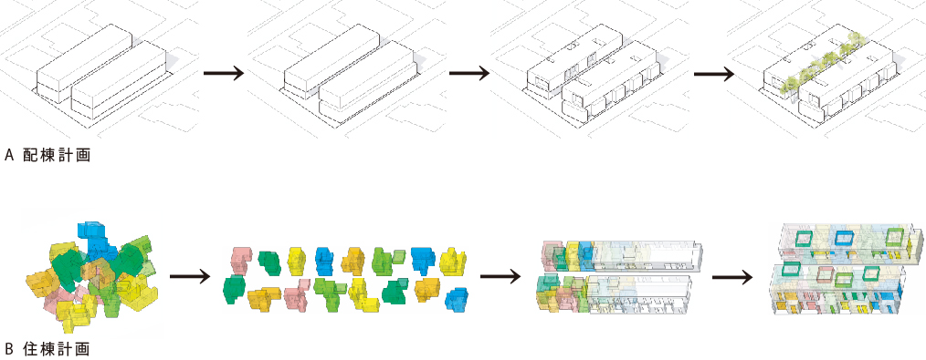 大小の空間がリズミカルに連なり、住戸ごとに異なるスケール感や距離感が宿ることで、単なる反復ではない多様な住まいの表情をつくり出している。