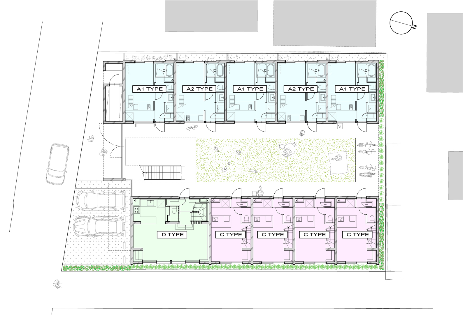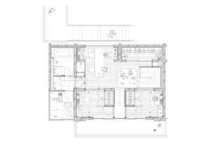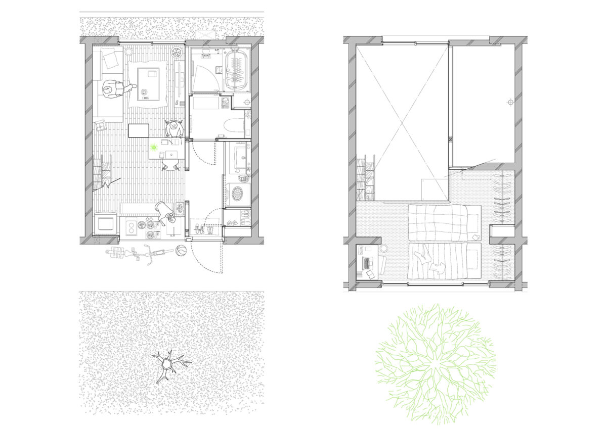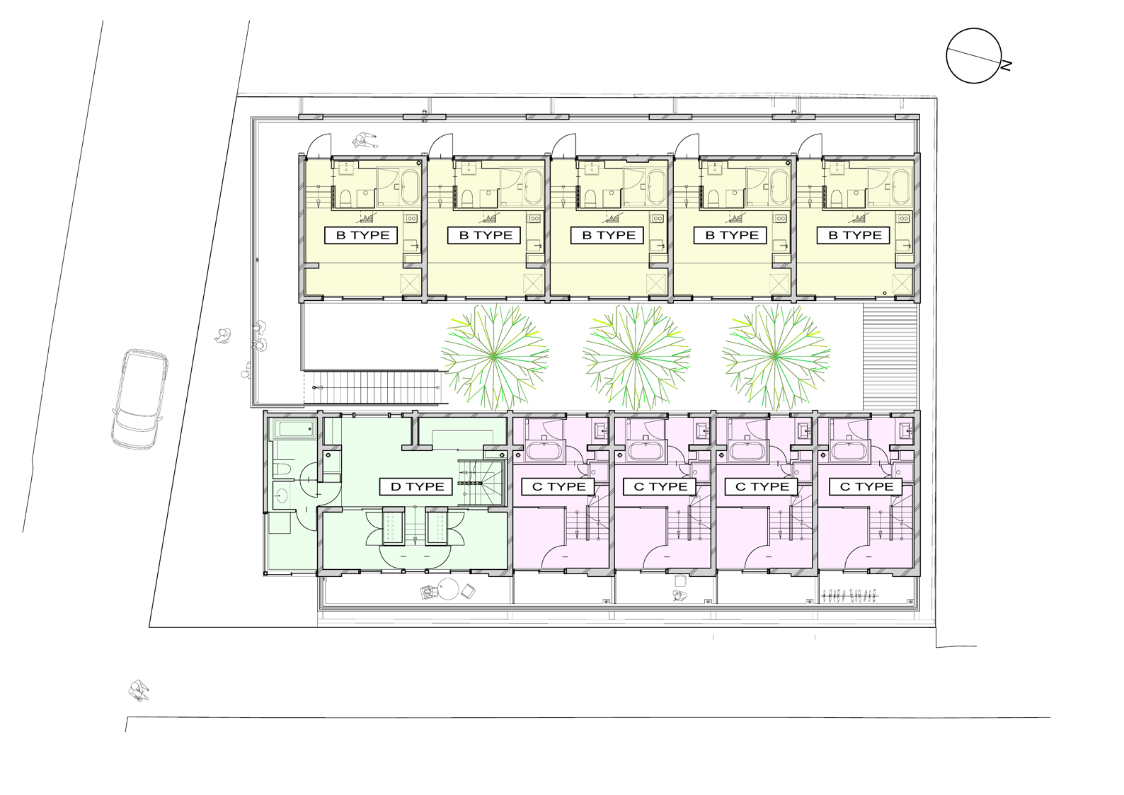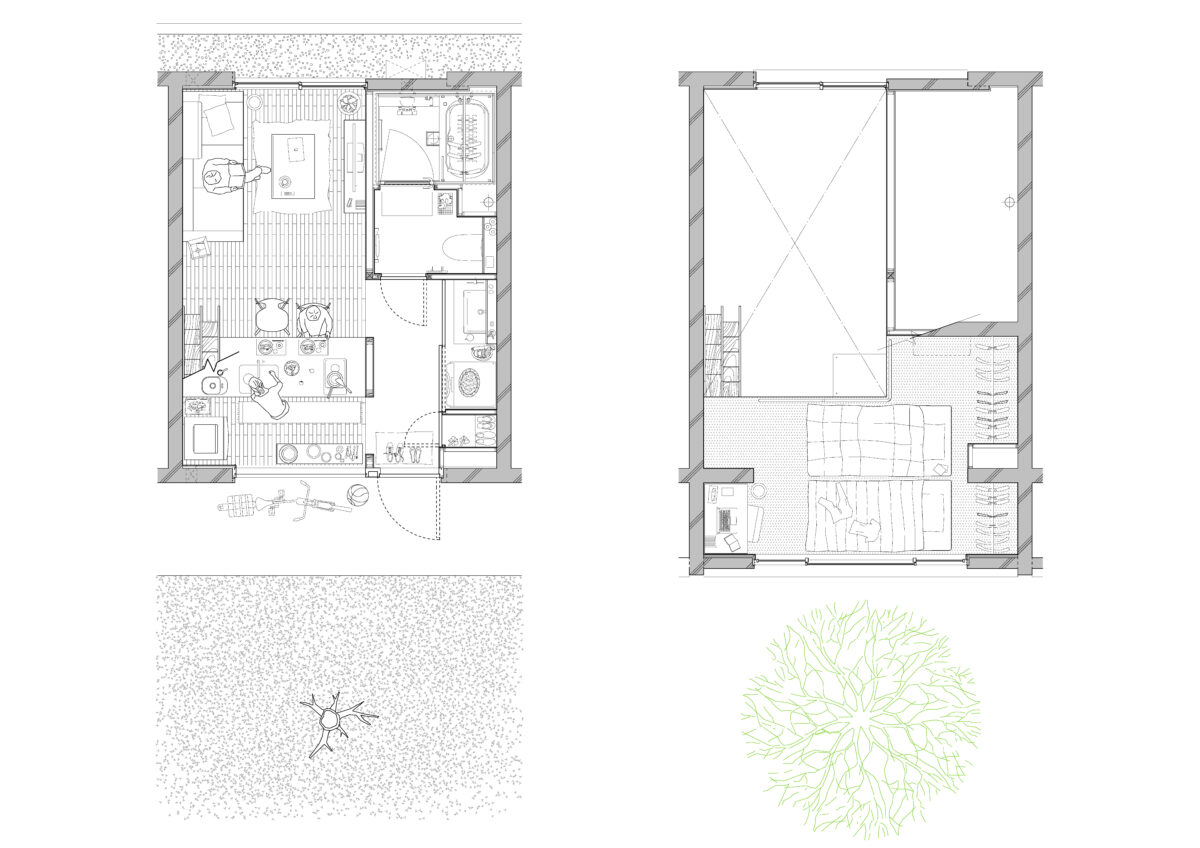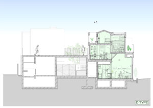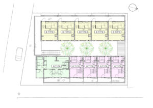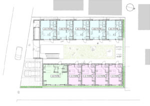 大小の空間がリズミカルに連なり、住戸ごとに異なるスケール感や距離感が宿ることで、単なる反復ではない多様な住まいの表情をつくり出している。