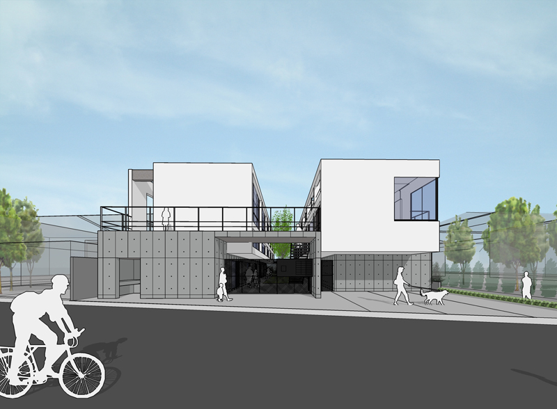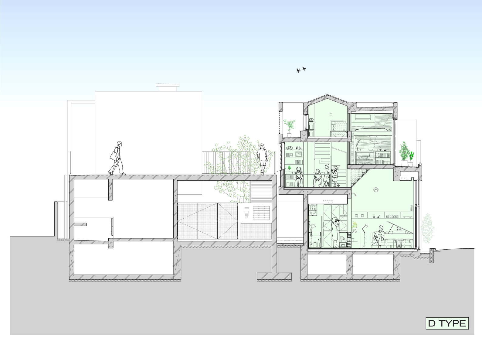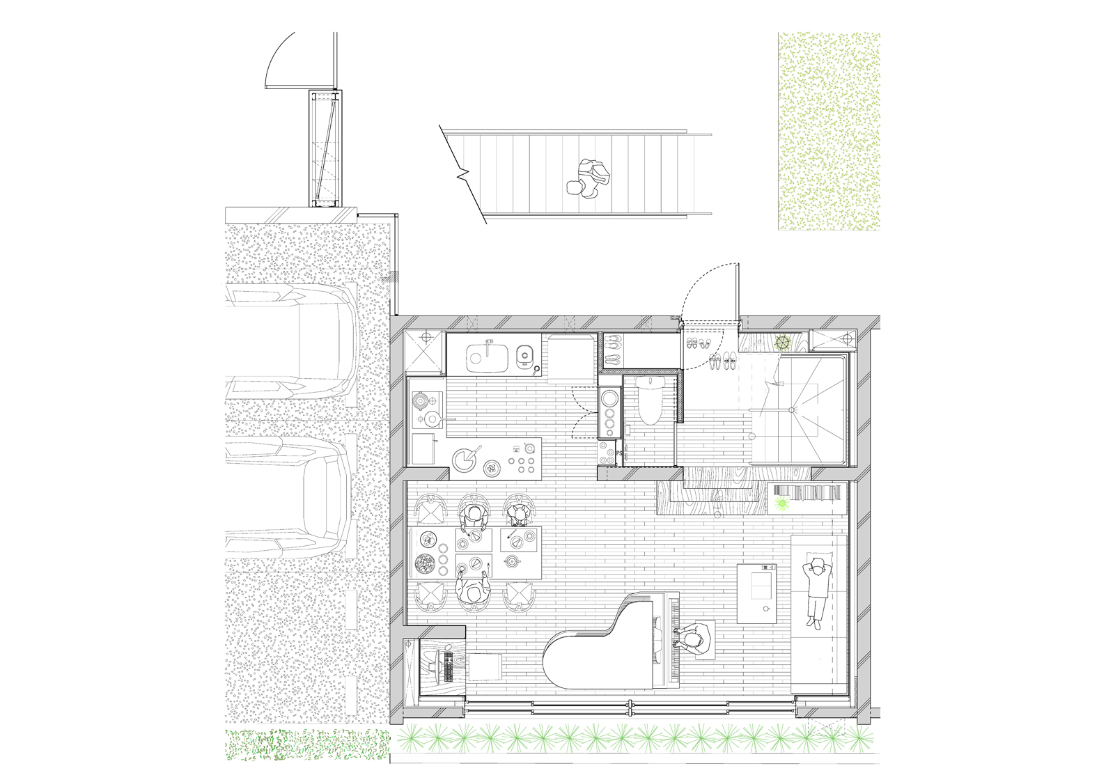 本計画は極めてシンプルな「ハコ形状をずらす」という操作を起点に、全体に多様な立体的仕掛けが有機的に絡み合う構成としている。