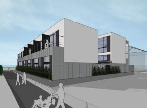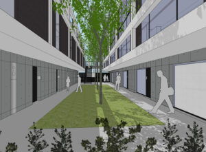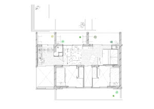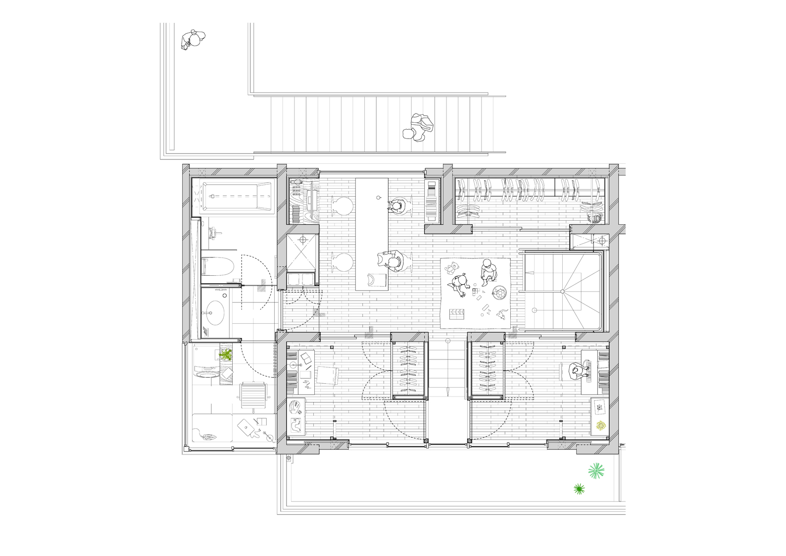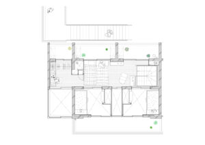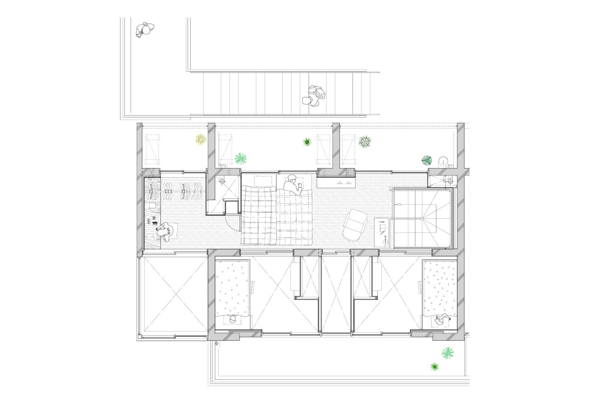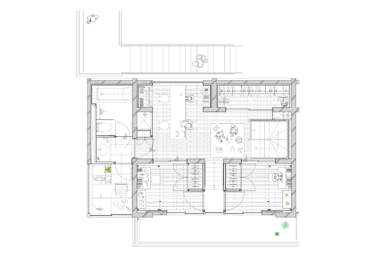 2階の外側へ向かってセットバックした部分は共用廊下やバルコニーとして活用され、外部と内部の中間的な場として、日常的な滞在や視線の広がりを支える要素となっている。