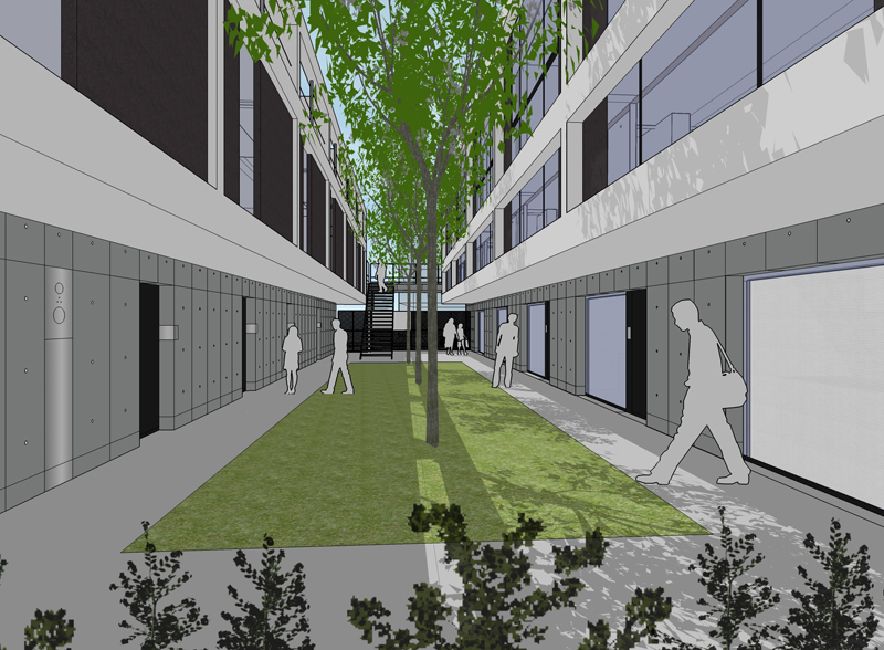 これにより、外部に対して開かれたゆったりとした住戸アプローチ空間が生まれ、敷地のコンパクトさを感じさせない伸びやかな導入体験を実現している。