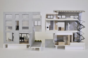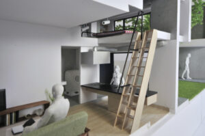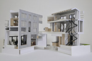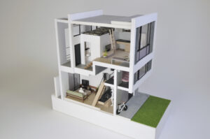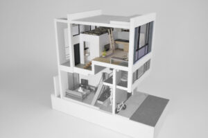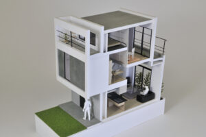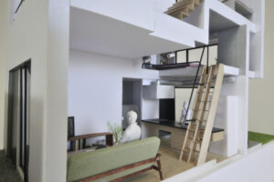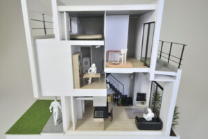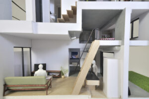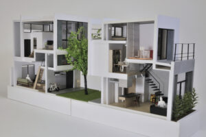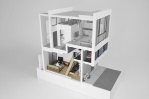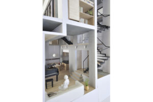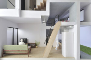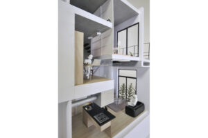 さらに、ハコをわずかにずらすというシンプルな形態操作によって、内部には思いがけない視線の抜けや段差、隠れた余白などが自然に生まれ、暮らしの中に小さな発見や楽しさをもたらしている。